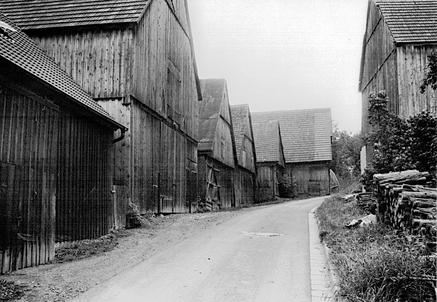 Sowohl in Unterfranken12 als auch in Teilen Südniedersachsens13 existieren in ähnlich strukturierten Klein- und Zwergstädten Häufungen von Scheunen, die man als Scheunenstraßen bezeichnen könnte. Hier sind die Scheunen zwar auch zeilenartig angeordnet, wie es häufig bei Scheunenvierteln zu beobachten ist und ebenso wie bei diesen durch eine eigene Straße erschlossen sind, der sie die Front zuwenden. Die Scheunen bilden hier jedoch den rückwärtigen Abschluss des Hofraums und haben somit direkten Anschluss an die übrigen Gebäude der Betriebseinheit. Auch im westlichen Oberfranken, in Rodach (Neugasse), und im östlichen Oberfranken, in Kirchenlaibach (Scheunenstraße), existieren solche Scheunenstraßen.14 Trotz der auf den ersten Blick physiognomischen Gleichartigkeit mit manchen Scheunenvierteln ist dies ein anderes Phänomen, wenn auch nach Gestaltung und Entstehungsweise Parallelen zu den oberfränkischen und oberpfälzischen Scheunenvierteln auszumachen sind.