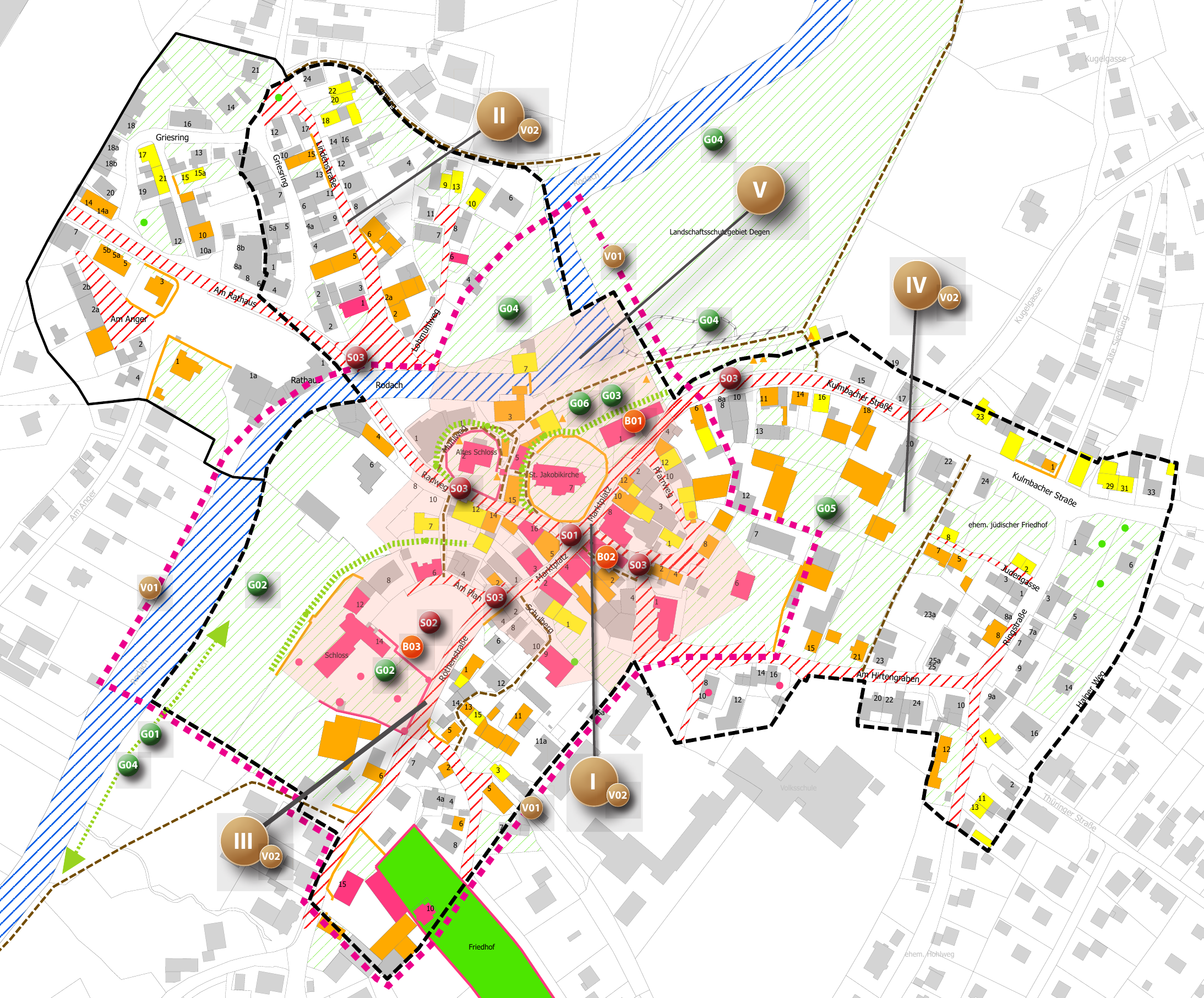Strukturmodell der Schwachstellen des historischen Siedlungskerns in Bezug auf den Denkmalwert. Entwurf: Thomas Gunzelmann, Grafik: Lisa Schuylenburg