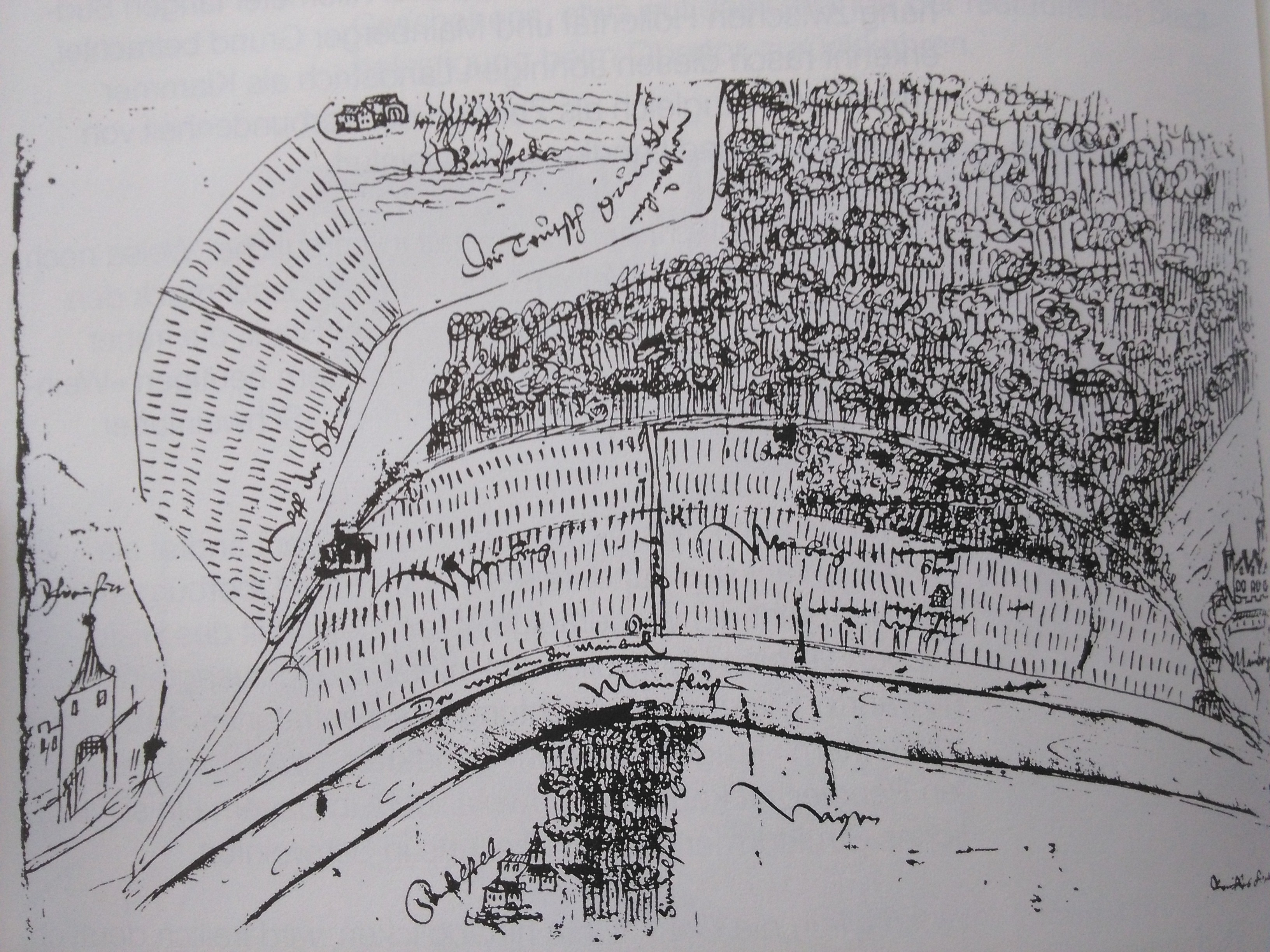 Zeichnung der Mainleite um 1562, C. H. v. Erthal (Hirsch 1989, 8, Original im Staatsarchiv Würzburg)