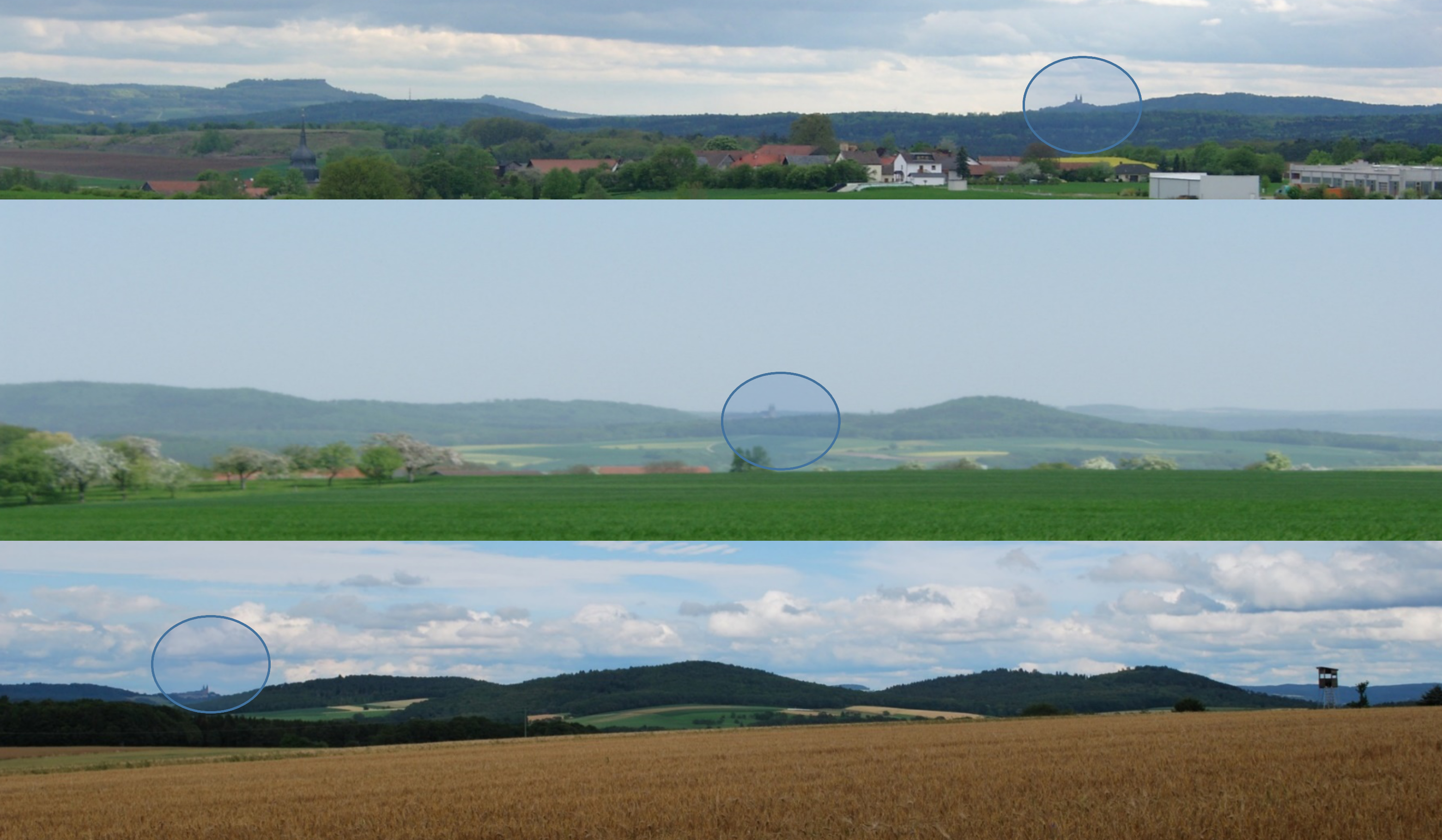 Ob ein Denkmal visuell in seiner Umgebung, sei es im dörflichen oder städtischen Raum sowie in darüber hinausreichenden kulturlandschaftlichen Zusammenhängen wirksam wird, hängt ganz banal von seiner Größe, vor allem seiner Höhe und von seiner topografischen Lage ab, die die Höhe des Objekts wesentlich übersteigern kann. In diesem Sinne verhalten sich unsere Beispiele geradezu diametral entgegengesetzt.