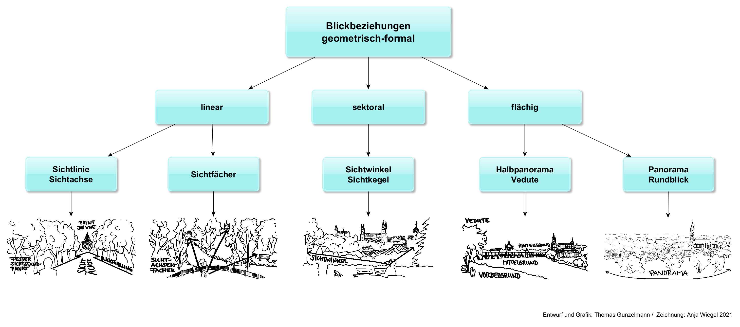 Die zweite Ebene ist die einzelner spezifischer Sichtbeziehungen. Sie können nach verschiedenen Kriterien kategorisiert werden, etwa geometrisch-formal, nach ihren Bezug zum jeweiligen Objekt, nach der Intention – gestaltet oder gewachsen – oder nach ihrem Bedeutungsinhalt. In jedem Fall müssen sie jedoch einen historisch begründeten Zusammenhang mit dem Denkmalobjekt besitzen.