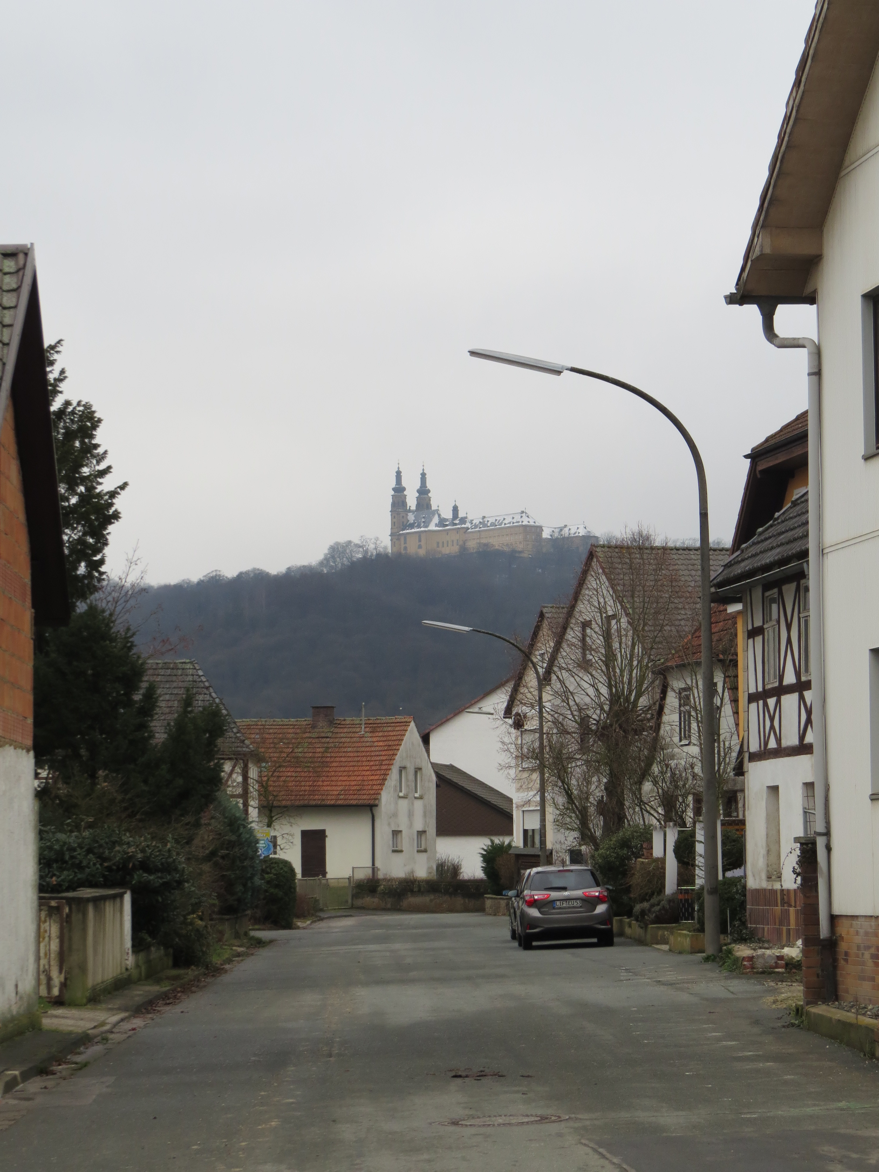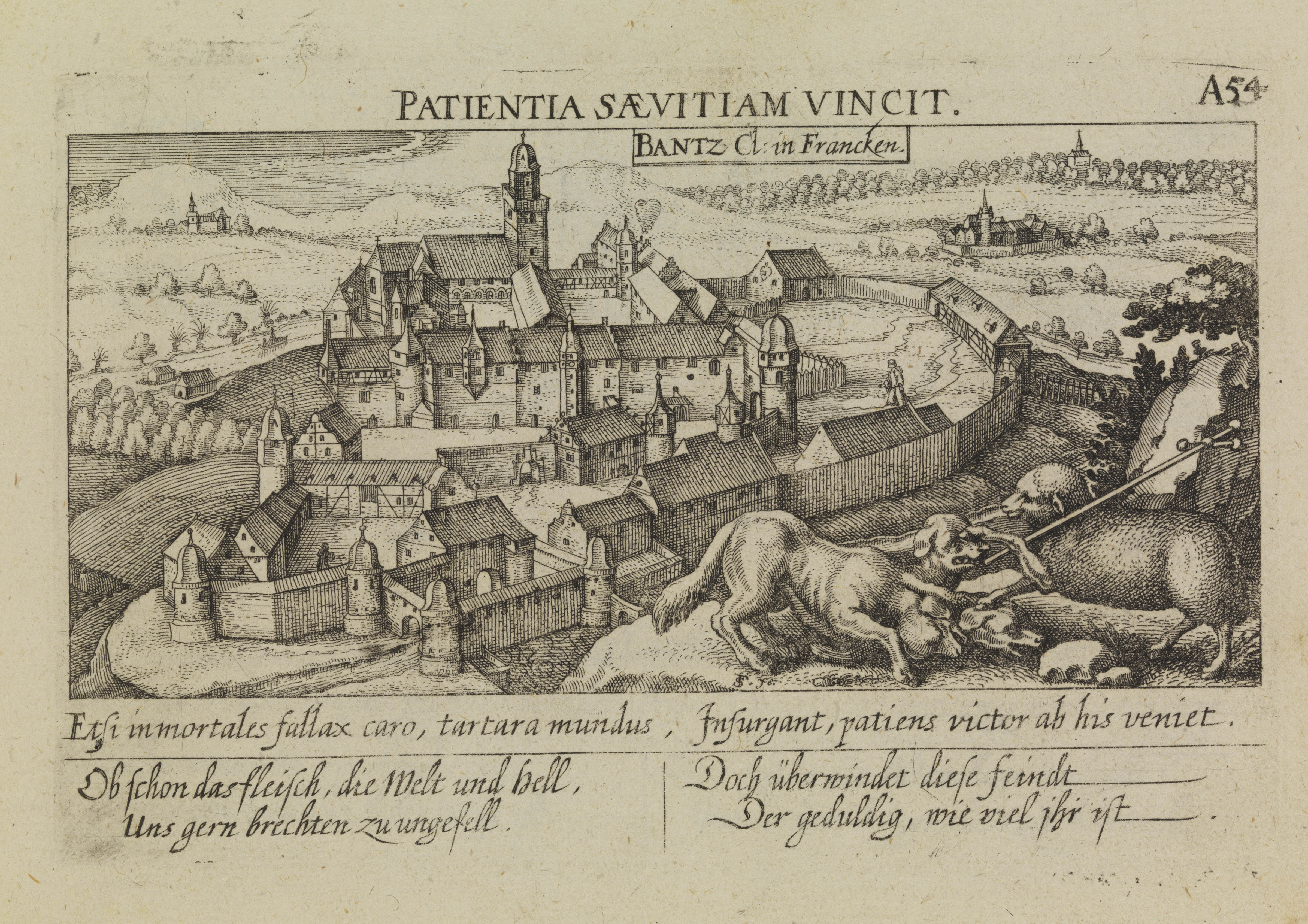 Fast zeitgleich wie der Ausblick aus Banz und somit vor der barocken Neugestaltung wurde auch der Anblick von Banz gewürdigt. Der Langheimer Abt Mauritius Knauer bemerkte 1653: auff Mitternacht zu liegt in vollem freyen Angesicht das schöne und berühmbte Closter Banz ^[…] auf einen hohen Berg.43 Dieser Text wurde in die Merian’sche Topographia Franconiae von 1656 übernommen und kann damit als ein damit als ein allgemeines Bildungsgut der Zeit gesehen werden.