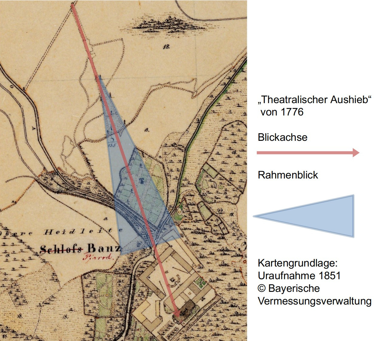 Ein bewusst angelegter Blick auf Banz findet sich 400m nordnordwestlich des Klosters, der aber nicht durch die vermeintliche Konkurrenz, sondern durch das Kloster selbst, bzw. durch dessen Mönch Johann Baptist Roppelt47 im Jahre 1775 als „theatralischer Aushieb“ eingerichtet wurde.48 Er ermöglichte einen Blick aus dem Wald über den „Mönchsspielplatz (‚Arboretrum recreationis’)“ zum Kloster. 1730 hatte Abt Benedikt Lurz hier einen Spielplatz „pro diversione machen mit steinernen tisch und bencken“ anlegen lassen49, zu welchem auch eine Kegelbahn und ein Schießplatz gehörten. Von einen Punkt 100m nördlich des Spielplatzes, damit 600m vom Kloster entfernt, legte Roppelt eine zunächst schmale, etwa 10 m breite Schneise an, die sich nach der Überquerung des Spielplatzes kurz noch weiter verengte, dann sich aber langsam sich trichterförmig erweiterte und am Waldrand eine Breite von 35 m erreichte. Damit erzielte er zwei unterschiedliche Bildwirkungen. Im nördlichen Teil handelt es sich um eine klassische Blickachse, die als point de vue die Kirche und besonders die beiden Türme hat. Je näher man dem Kloster rückte, desto breiter wurde die Sicht auf die Anlage. Am Waldrand ist das gesamte Kloster in einem Rahmenblick bühnenbildartig seitwärts von Bäumen gerahmt, weswegen es wohl zum Namen „theatralischer Aushieb“ kam.50