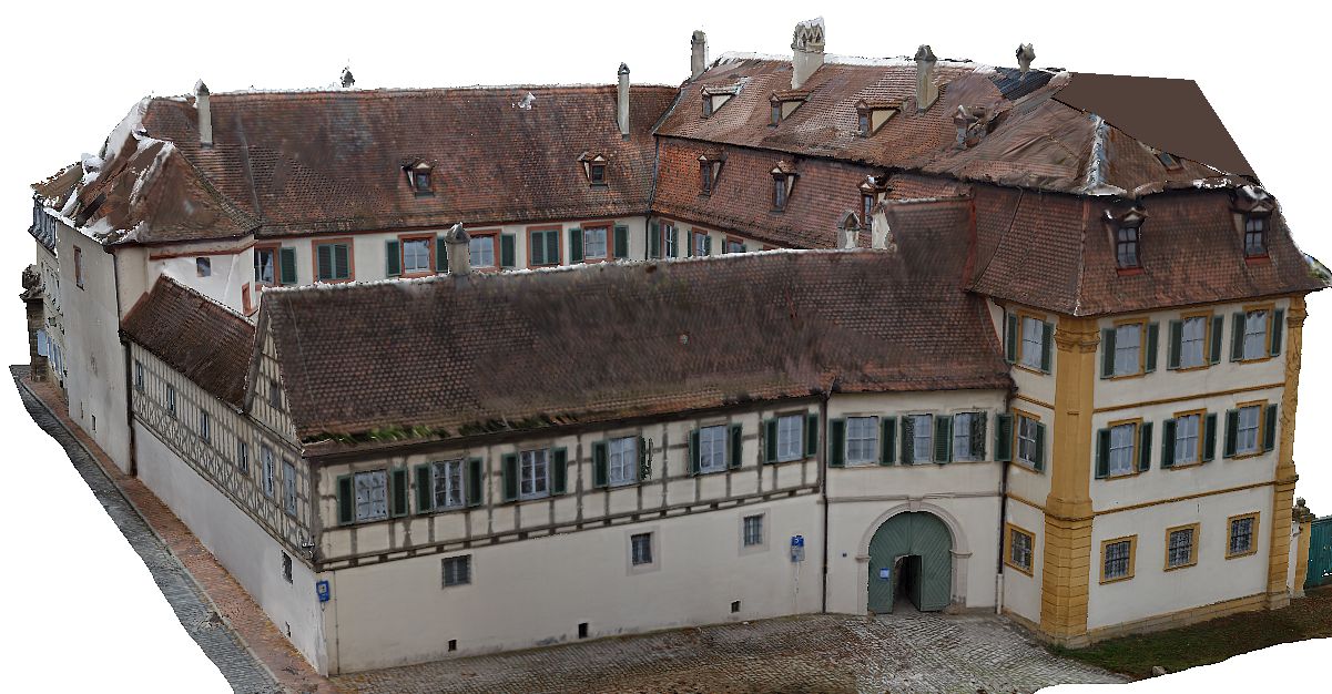 Eine Ansicht aus der Vogelschau von Daniel Meisner (1585-1625)21 um 1620 zeigt die gewachsenen mittelalterliche und nachmittelalterliche Struktur der Klosteranlage. Innerhalb der Mauer lässt sich zwar eine Trennung zwischen dem eigentlichen, dichter bebauten Klausurbereich und dem lockerer bebauten Wirtschaftsbauten feststellen, aber insgesamt ergibt sich ein ungeregeltes Bild. Die Anlage ist von einer Mauer umgeben, außerhalb fanden sich schon weitere zum Kloster gehörige Bauten.