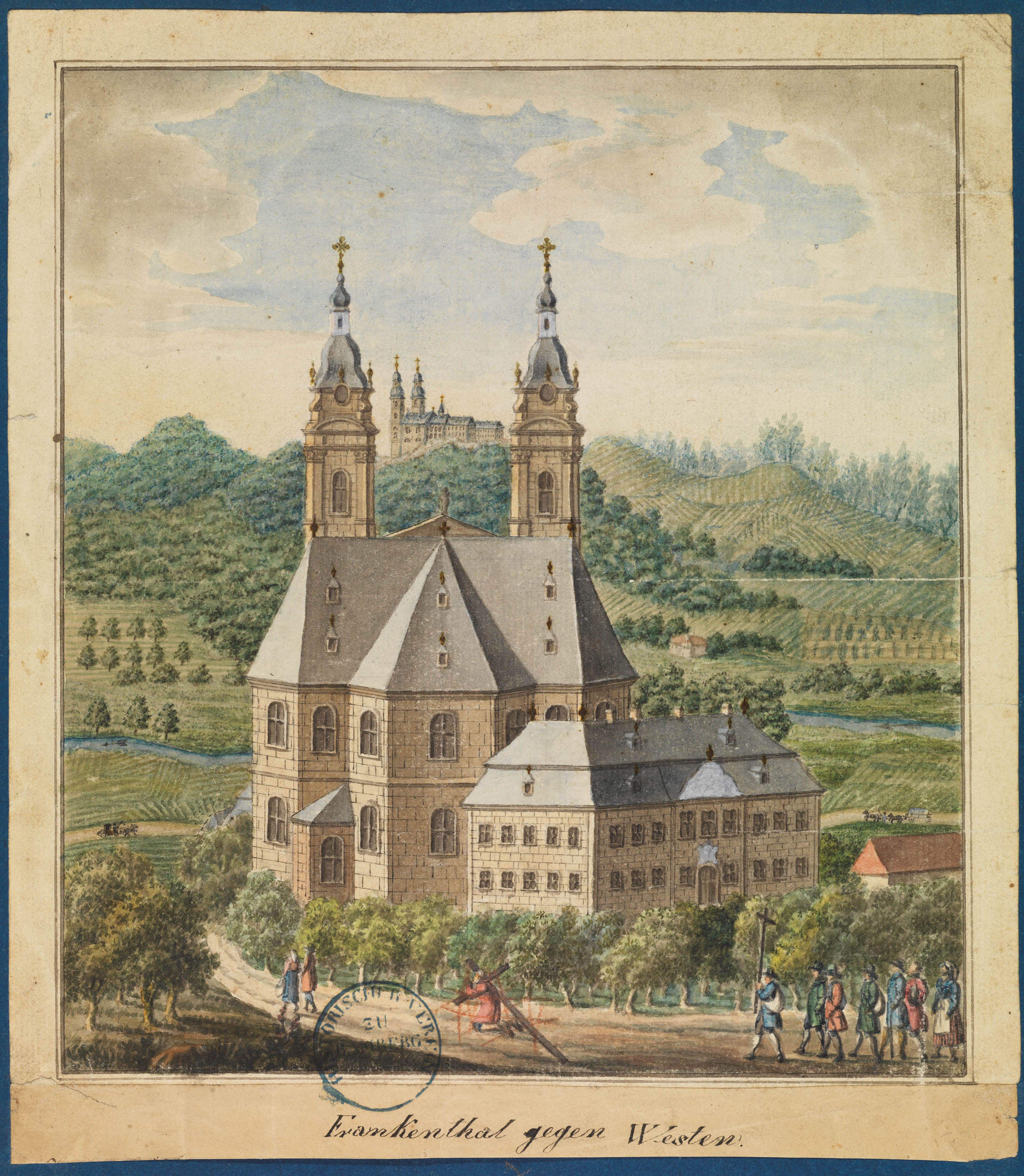 Der barocke Umbau begann unter 1681 unter Abt Thomas Wagner (1677-1689) mit dem östlichen Konventflügel und gewann an Dynamik mit Abt Gallus Knauer (1690-1728), der den bereits an der Mutterabtei Ebrach tätigen Leonhard Dientzenhofer verpflichtete, der parallel zum Konvent den Abteiflügel errichtete. Ab 1727 war der sächsisch-weimarische Hofarchitekt Gottfried Heinrich Krohne als Baumeister des Fürstenbau oder der neuen Abtei tätig. Schließlich erbaute er unter Abt Stefan Mösinger (1734-51) den Konvent bis 1742 neu. Auch unter dem Einfluss Balthasar Neumanns war nun eine regularisierte prachtvolle Barockanlage entstanden.22 Wenn jener auch 1742 Entwürfe für den Neubau der Klosterkirche fertigte, schloss schließlich der vom Kloster zu verantwortende Neubau der Wallfahrtskirche Vierzehnheiligen deren Umsetzung aus.23 Noch unter dem letzten Abt Candidus Hemmerlein (1791-1802) wurde der Konvent nach Osten erweitert, was durchaus verwunderlich ist, denn der wirtschaftlich denkende Abt hielt in einer nüchternen Zeit doch am prachtvollen Konzept der ersten Jahrhunderthälfte fest.24 Wie in Banz und auch im Mutterkloster Ebrach war schließlich ein einheitlicher, schlossartiger Komplex entstanden, im Gegensatz zu Banz blieb in den Zisterzen allerdings die frühgotische Klosterkirche erhalten.