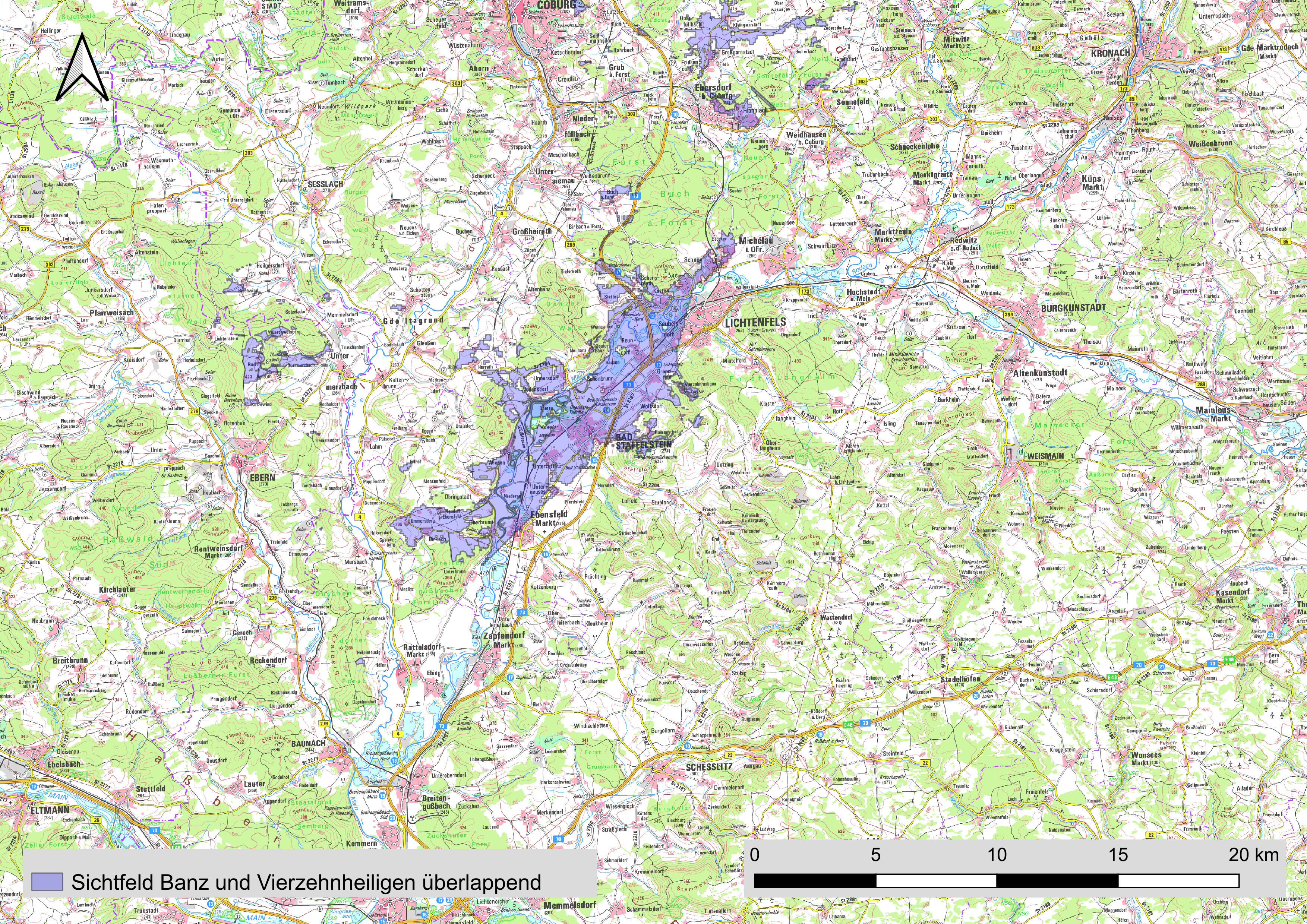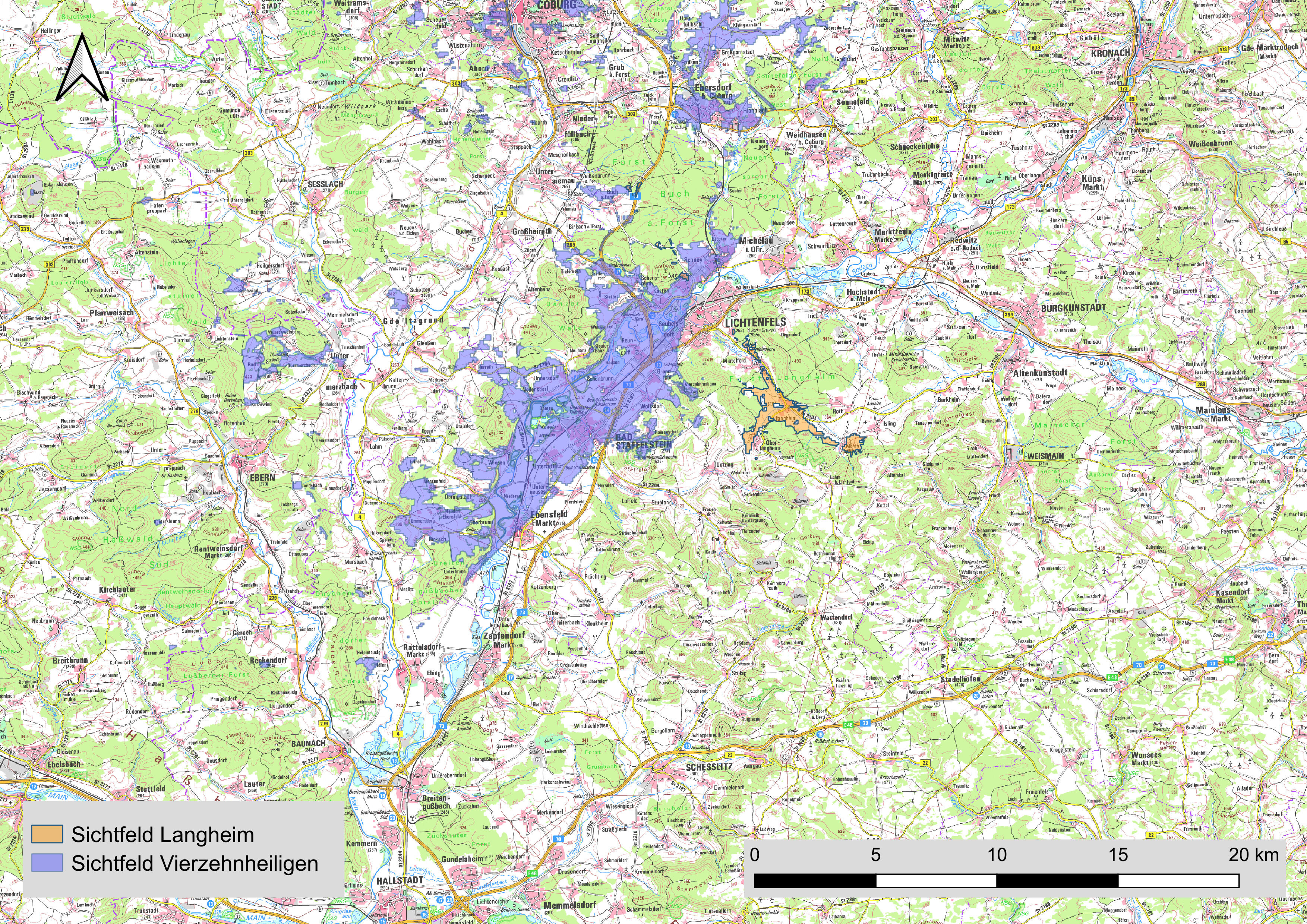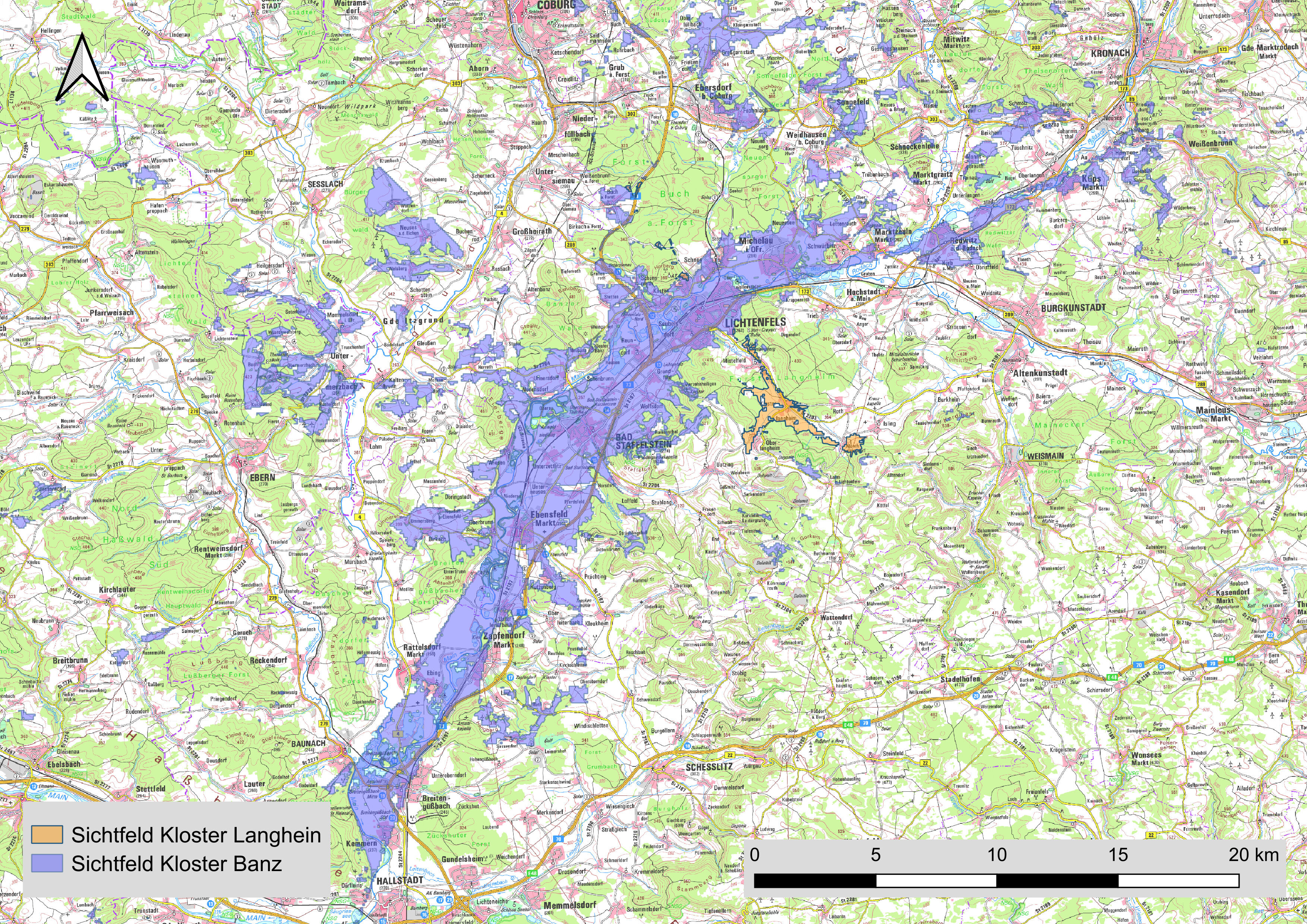 Da der Freistaat Bayern noch nicht alle hochauflösenden Geodaten im Rahmen der Open-Data-Initiative zu Verfügung gestellt hat, musste auf die geringer auflösenden DGM-Satelliten-Daten im recht alten SRTM-Format der NASA32 zurückgegriffen werden. Da SRTM ein Geländemodell ist, Vegetation und Bebauung also nicht enthält, wurde das errechnete Sichtfeld um die Waldflächen verkleinert.33 Auf die Herausrechnung der Siedlungsflächen wurde dagegen verzichtet, da innerhalb von Siedlungen über Bebauungslücken oder Straßen durchaus Blickbeziehungen möglich sind, im konkreten Fall von Kloster Banz durchaus beziehungsreiche.