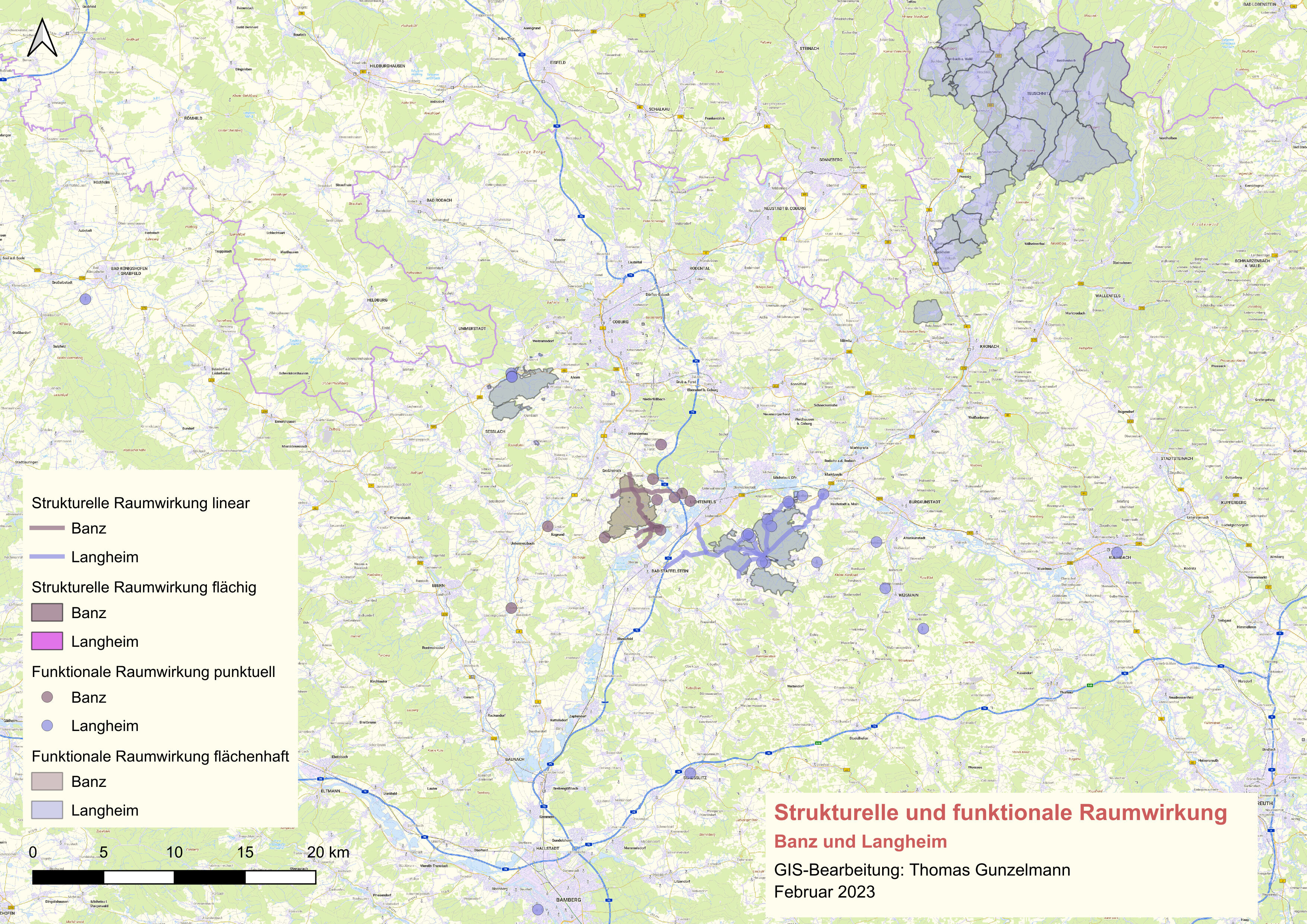 Die strukturell-funktionale Raumwirkung der beiden Klöster manifestiert sich in materiellen Hinterlassenschaften, sei es baulicher oder landschaftlicher Art. Sie lassen sich je nach Ausprägung als einzelne Punkte, als Linien- oder Flächenelemente kartieren. Insgesamt zeigt sich Banz räumlich beschränkter als Langheim, wenngleich es in seinem engeren Stiftsgebiet durchaus prägende Bauten und landschaftliche Strukturen hinterlassen hat. Langheim greift hier viel weiter aus, sowohl in seinen punktuellen Elemente wie den entfernten Stadthöfen in Bamberg oder Kulmbach als auch in seinen flächenhaften Wirkungen. Wiewohl der letzte sichere Nachweis fehlt, scheint es in den 200 Jahren seiner Herrschaft im Frankenwald die bis heute an ihren Orts- und Flurstrukturen ablesbare Rodungslandschaft geprägt zu haben.