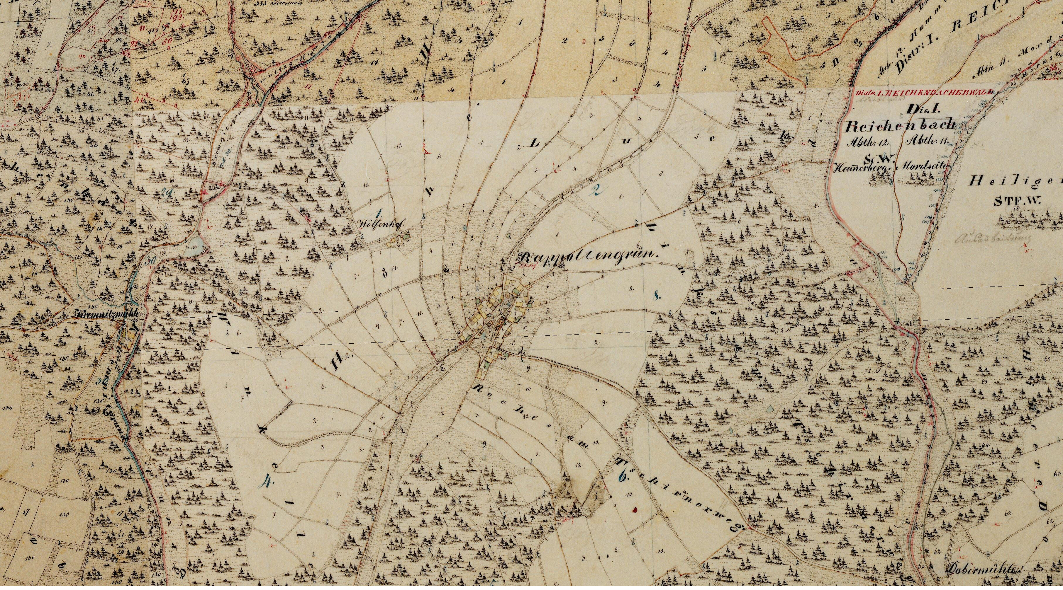 Für die benachbarte „Einöde Teuschnitz“ liegen derartige Analogieschlüsse nicht so nahe, die Siedlungsformen wie auch die Ortsnamen differieren stärker. Immerhin findet sich am Nordrand dieses Gebietes mit dem Ort Rappoltengrün eine Siedlung, die in ihrem Bestimmungswort wohl sicher auf den Raboto, den zweiten Abt von Langheim (1187 - 1207) zurückzuführen und damit als vom Kloster initiierte Gründung zu sehen ist. In ihrem Grundwort „-grün“ wie auch in ihrer Siedlungsform als hufeisenförmiges Rundangerdorf mit Radialhufenflur entspricht sie der Leitform des Frankenwaldes, die wohl von mehreren Herrschaftsträgern angewendet wurde. Es spricht einiges dafür, dass Langheim sich auf der ganzen Fläche des „solitudo“ engagierte, ein für alle Dörfer gültiger Nachweis steht noch aus.