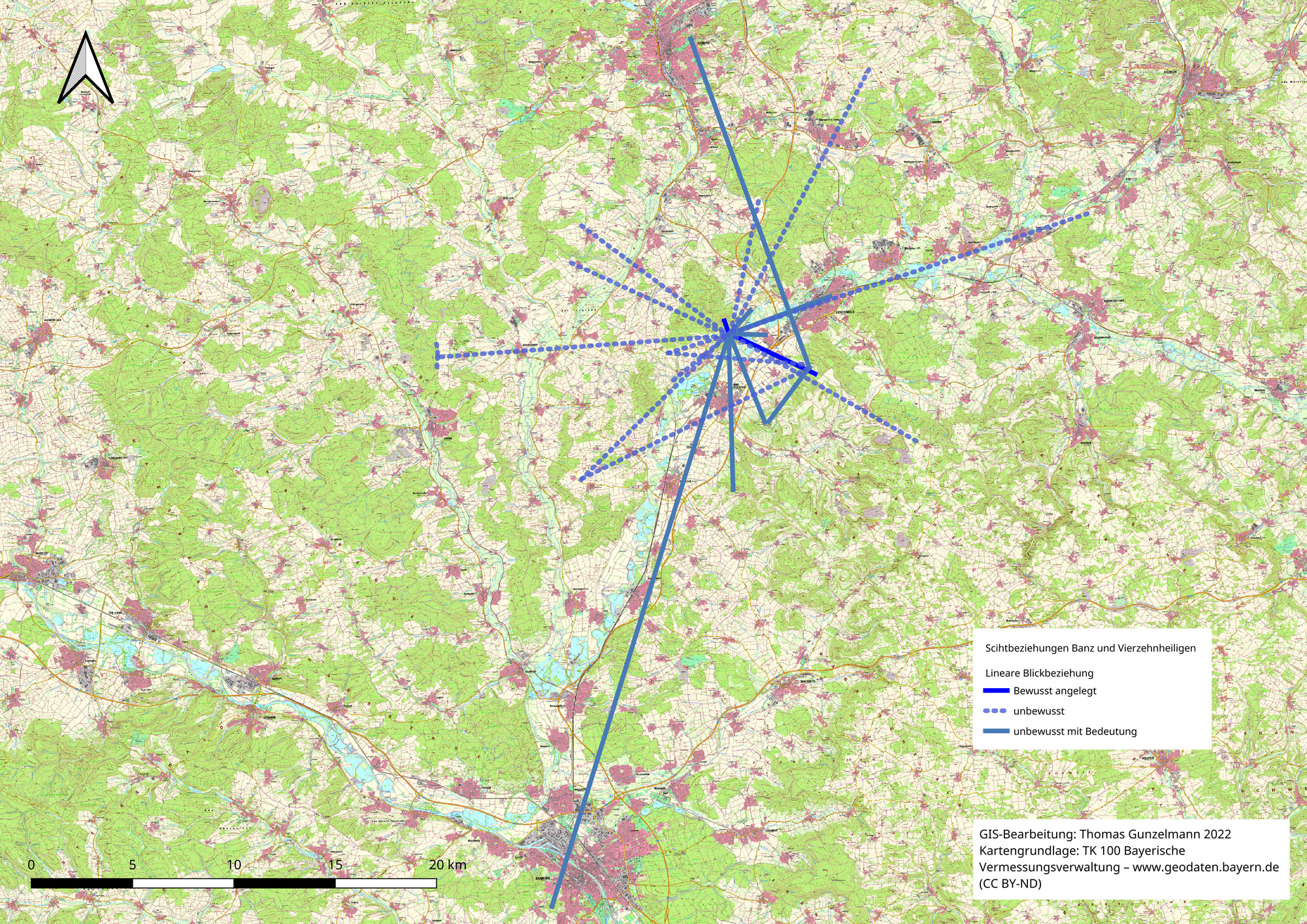 Überlagert man nun das etwas Sichtfeld von Banz mit dem kleineren von Vierzehnheiligen und bildet die gemeinsame Schnittmenge, so erhält man eine Raumkonstruktion, die uns nun bereits zur dritten Kategorie der Raumbezüge von Denkmalen führt, den assoziativ-symbolischen. Denn in diesem Areal im Maintal und der westlichen Randhöhen könnte man, will man einen assoziativen Landschaftsbegriff geographisch grundieren, den Umfang des sogenannten „Gottesgartens“ am Obermain definieren. Letztendlich wurde diese nicht nur im Tourismus, sondern auch in der Diskussion um die Erhaltung der Kulturlandschaft verwendete schlagwortartige Bezeichnung durch die visuelle und funktionale Raumwirkung der beiden zur Rede stehenden Klöster hervorgerufen.