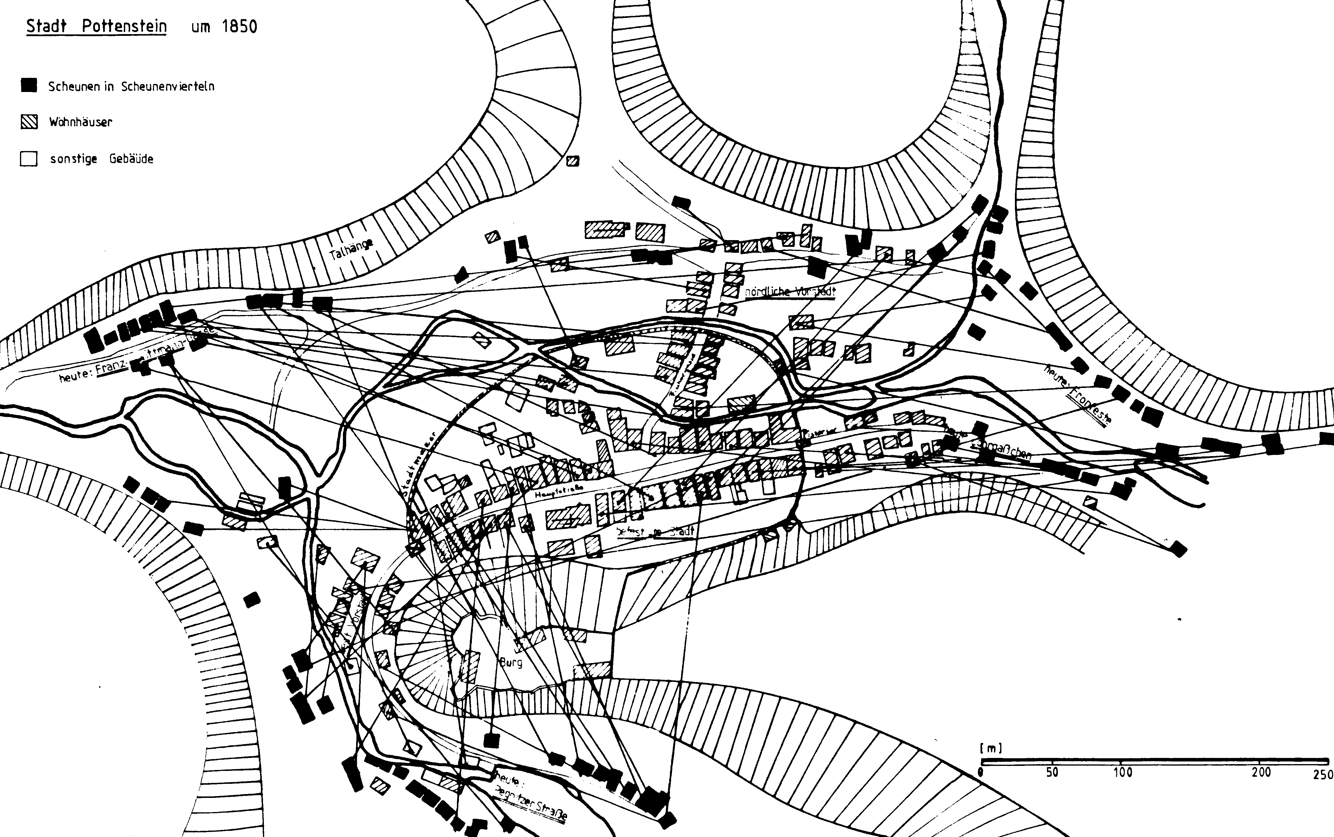 Bei der Anlage von Scheunenvierteln wurde darauf geachtet, nach Möglichkeit keine landwirtschaftlich wertvollen Flächen in Anspruch zu nehmen. Dabei schreckte man gerade im Bereich der Fränkischen Alb, wo sich die städtischen oder stadtähnlichen Siedlungen häufig durch ihre enge Tallage auszeichnen, nicht vor stark hängigen Gelände zurück, wie etwa in Hollfeld22 oder in Gräfenberg. In Pottenstein suchte man Standorte auf, die wegen der umgebenden steilen Hänge lange beschattet wurden und damit ebenso wenig geeignet für andere Nutzungen waren.23