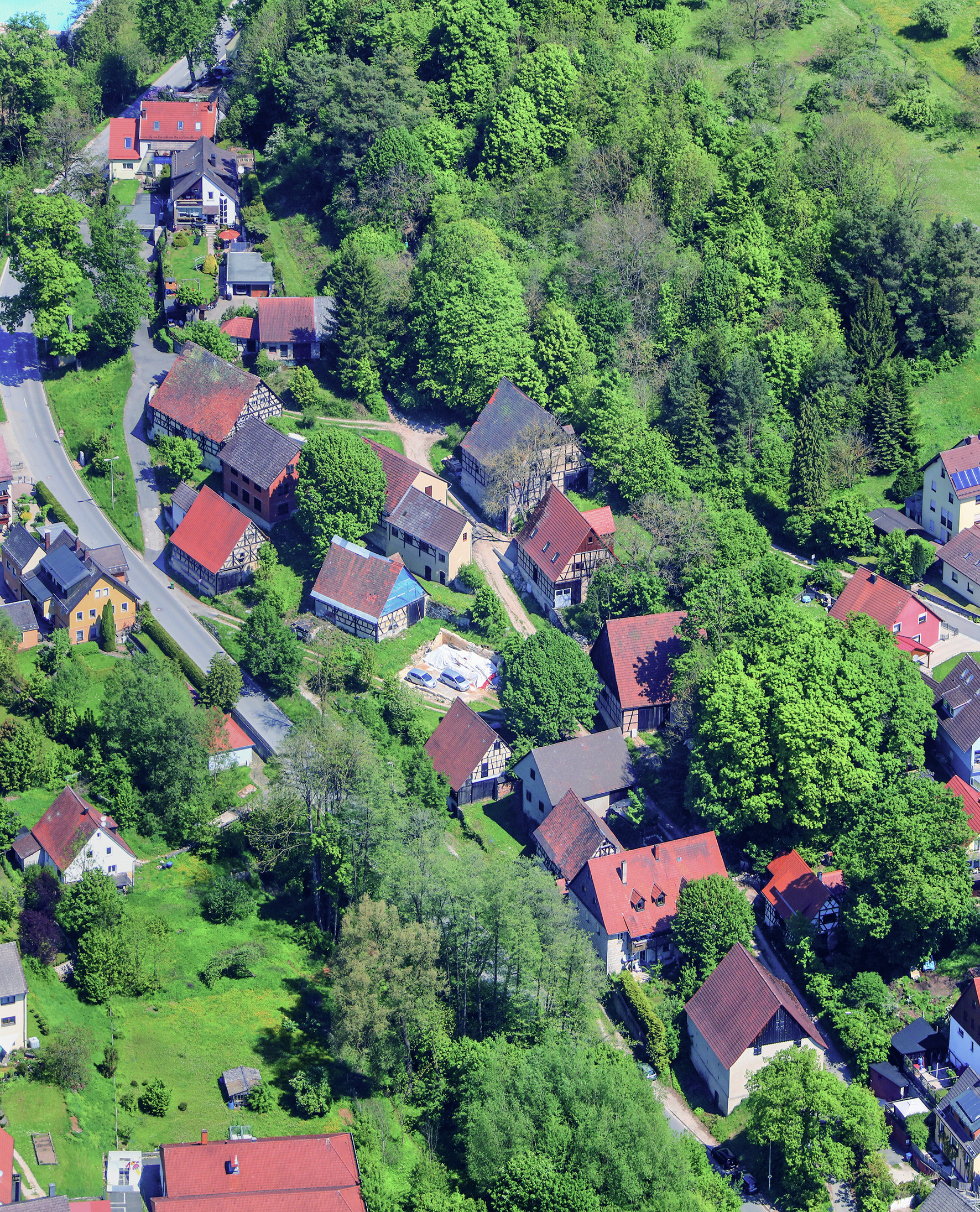 Das Ensemble „Scheunenviertel an der Egloffsteiner Straße“ in Gräfenberg (Lkr. Forchheim) als Beispiel für eine Scheunenballung. Foto: BLfD Luftbilddokumentation, Nr. 5SR28007-6332/028, Klaus Leidorf, 18.05.2017