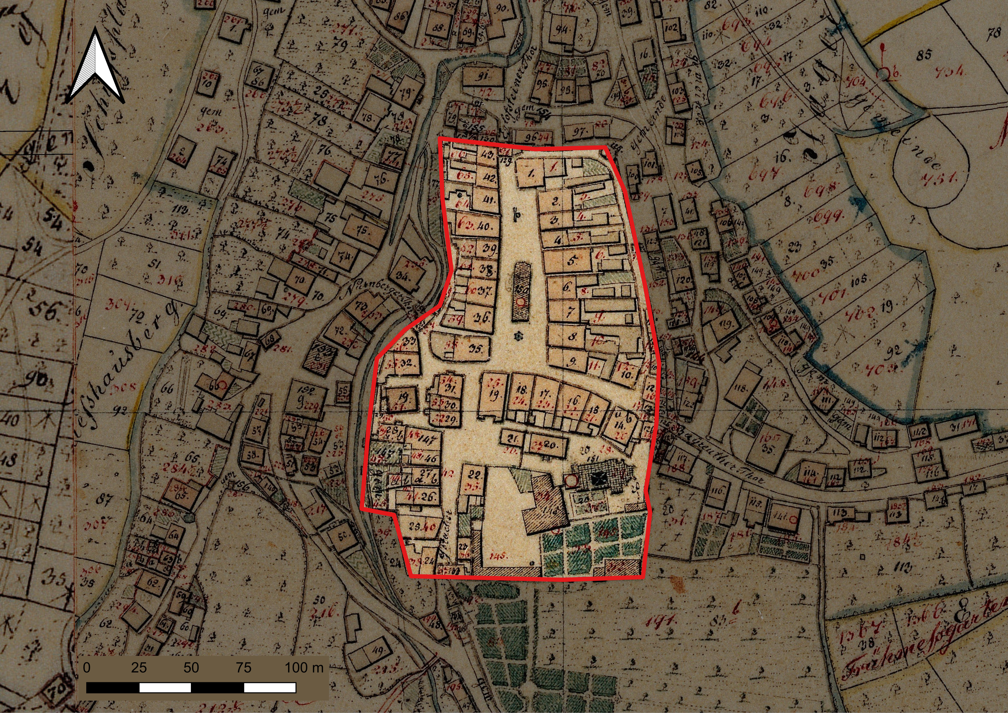 Schriftliche Quellen, insbesondere Akten und Urkunden und historische Karten und Pläne, sind für Oberfranken im Staatsarchiv Bamberg und in einzelnen Stadtarchiven gesammelt. Da die Stadtarchive, vor allem in den kleineren Orten, nur selten gut erschlossen sind, musste weitgehend auf das Material des Staatsarchiv Bamberg zurückgegriffen werden. Aber auch hier gestaltete sich die Suche nach einschlägigen Quellen nicht einfach. Obwohl es sich bei den Scheunenvierteln in vielen Fällen um augenscheinlich geplante Anlagen handelt, lassen sich keine Akten oder Urkunden finden, die sich direkt auf die Einrichtung eines Scheunenviertels beziehen. Hinweise finden sich dagegen oft in den Brandakten der Regierung von Oberfranken.24 Diese Akten beschränken sich zeitlich auf das 19. und frühe 20. Jahrhundert, so dass man für weitere Informationen aus früherer Zeit überwiegend auf zufällige Funde angewiesen ist.