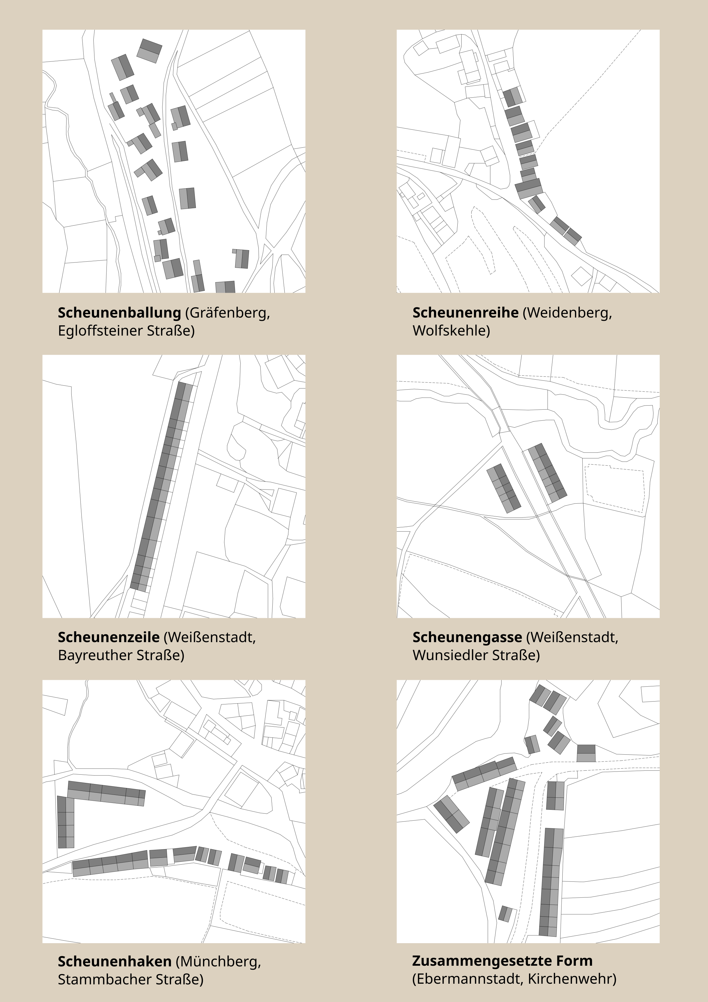 Immer sind jedoch auch zusammengesetzte Formen denkbar. Scheunenviertel, die aus winkelig angeordneten Zeilen bestehen, kommen sogar häufiger vor, wie etwa in Weidenberg.