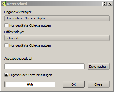 Dazu nimmt man als Eingangsvektorlayer die digitalisierte Uraufnahme und als Differenzlayer den aktuellen Gebäudelayer. Das Ergebnis zeigt die Gebäudegrundrisse, die um 1850 da waren und es heute nicht mehr sind, als eigenständigen Shape-Layer.