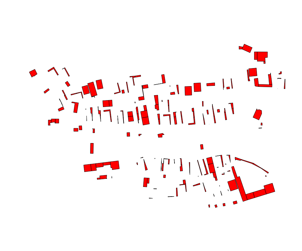 Dreht man die Eingabefelder um und nimmt den heutigen Gebäudebestand als Eingangslayer, so erhält man über das Werkzeug “Unterschied” die seit 1850 neu hinzugekommenen Gebäudegrundrisse.