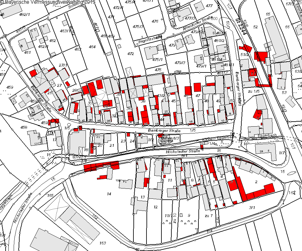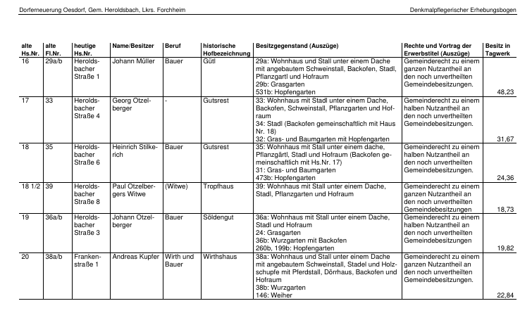 Grundsätzlich sind für den denkmalpflegerischen Erhebungsbogen zwei Kartengrundlagen von entscheidender Bedeutung: die aktuelle digitale Flurkarte der Bayerischen Vermessungsverwaltung (DFK der BVV) für die Darstellung der heutigen Situation, insbesondere der aktuellen Denkmalwerte, sowie der Extraditionsplan oder der Liquidationsplan oder auch die Uraufnahme, also die Ergebnisse der ersten bayerischen Katastervermessung aus der Mitte des 19. Jahrhunderts, um die Siedlungsgeschichte und die historische Ortsstruktur analysieren und darstellen zu können.