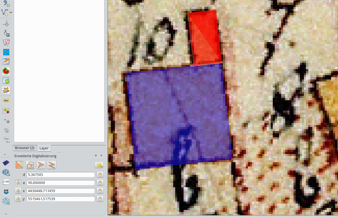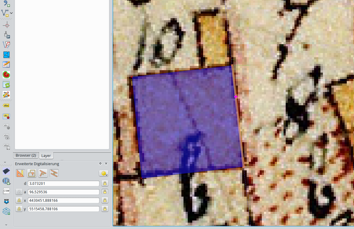 Normale Gebäude werden am leichtesten mit CADDigitize erzeugt (In QGIS 3 standardmäßig dabei als Werkzeugleiste für Formen). Dies ermöglicht es beispielsweise ein Rechteck aus drei Punkten zu erzeugen. Da Häuser, auch historische, doch in aller Regel einen (weitestgehend) rechtwinkligen Grundriss aufweisen, ist dies ein guter Weg, Hausgrundrisse zu digitalisieren. Mit dem normalen Polygontools wird man nur selten wirklich vier rechte Winkel und gleichlange parallele Seiten erreichen.