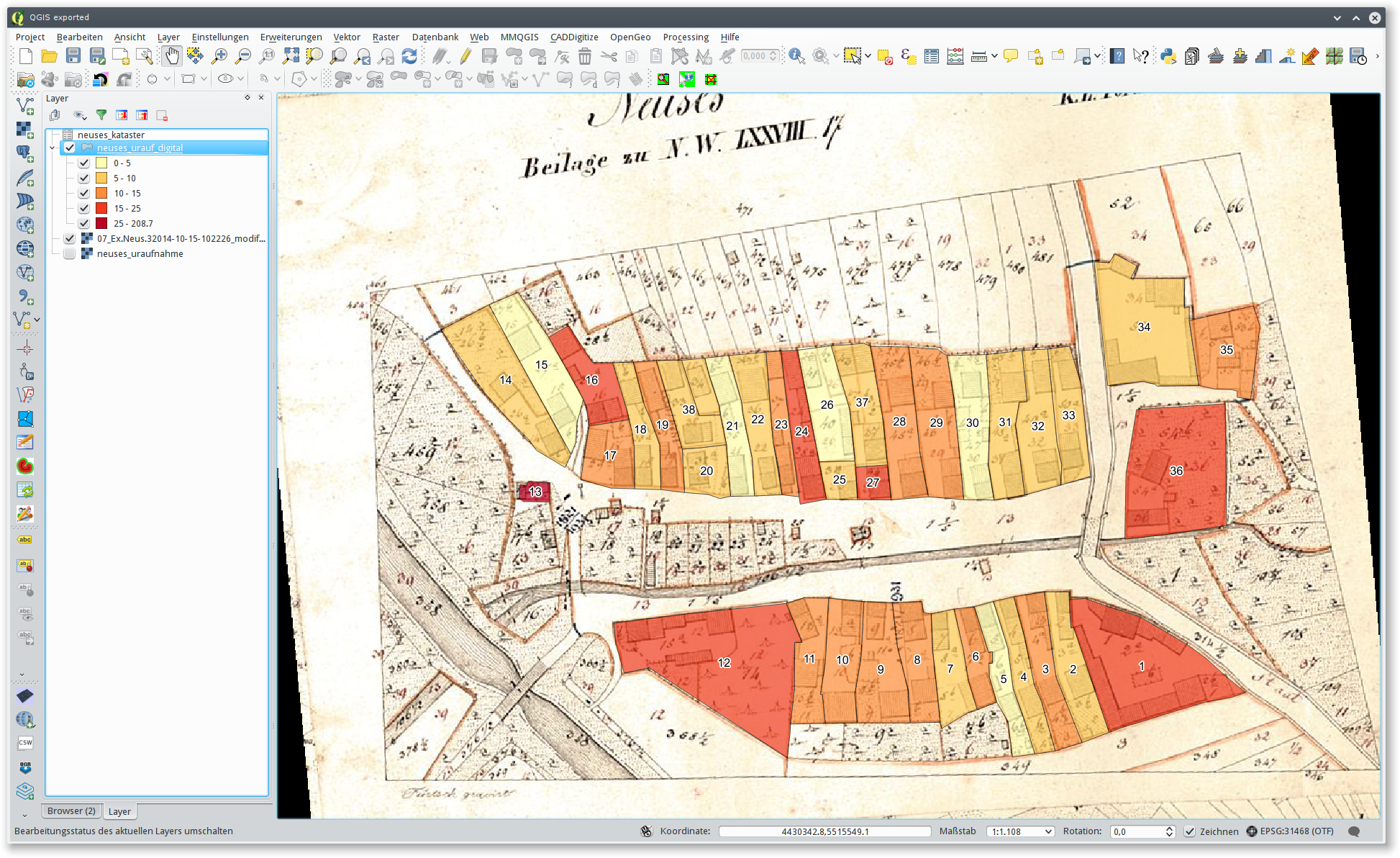 Hat man die Uraufnahme digitalisiert, so kann man QGIS die Unterschied der beiden Zeitschichten berechnen lassen und ist so nicht auf eine mühselige visuelle Prüfung der Überlagerung der analogen Ortspläne angewiesen.