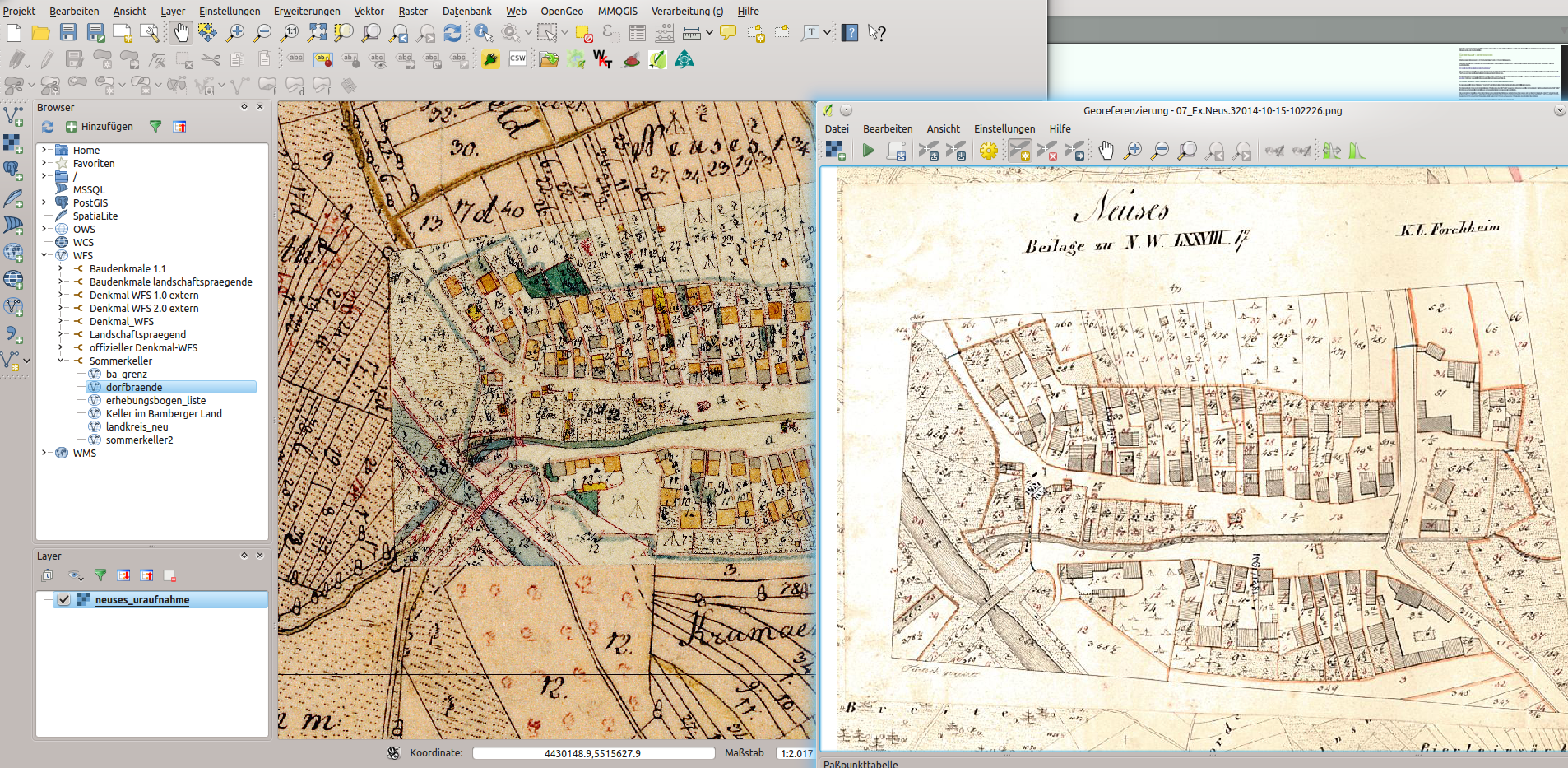 In der Layer-Leiste links neben dem Hauptkartenfenster sammeln sich im Laufe des Bearbeitungsprozesses die Basiskarten, wie DFK, Luftbild oder Uraufnahmeplan. Dazu kommen Arbeits- und schließlich Ergebniskarten. Dabei können unterschiedlichste Raster- und Vektorformate zusammenkommen und grundsätzlich auch so kombiniert werden.