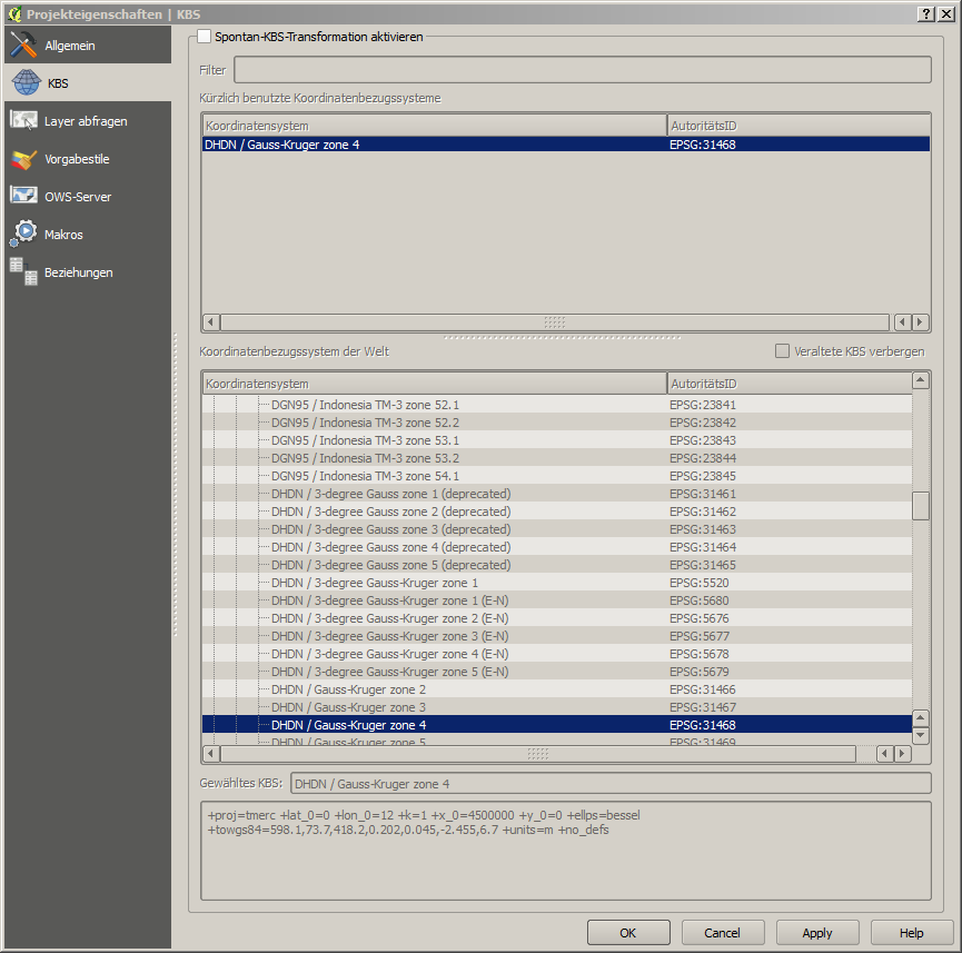 Am besten ist es, zu Beginn der Arbeit an einem Projekt unter „Projekt“ – „Projekteinstellungen“ – „Projekteigenschaften/KBS“ die Projektion 31468 einzustellen. Zusätzlich sollte man das Häkchen bei Spontan-KBS-Transformation aktivieren, dann sollten Layer, die eine andere Projektion mitbringen, automatisch an das Projekt-KBS angepasst werden.