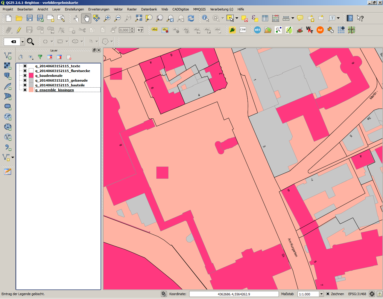 Die Karte der denkmalpflegerischen Interessen verlangt unter Umständen noch etwas mehr an Aufbereitung. Der Maßstab sollte idealerweise 1:1000 sein oder nah an 1:1000 liegen, denn nur so behalten die Beschriftungen der Grundkarte ihre sinnvolle Position.