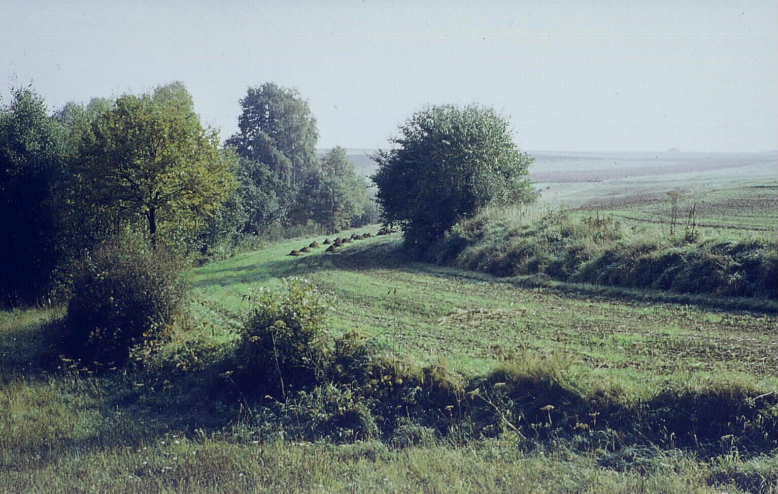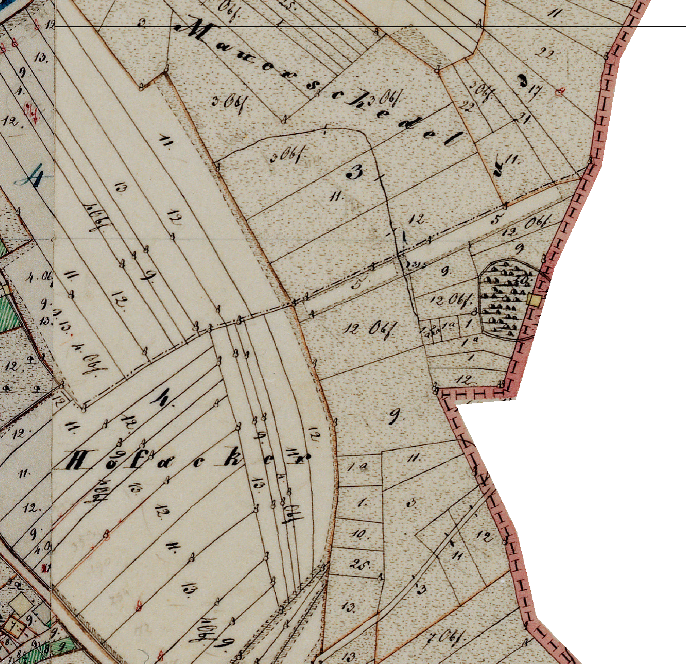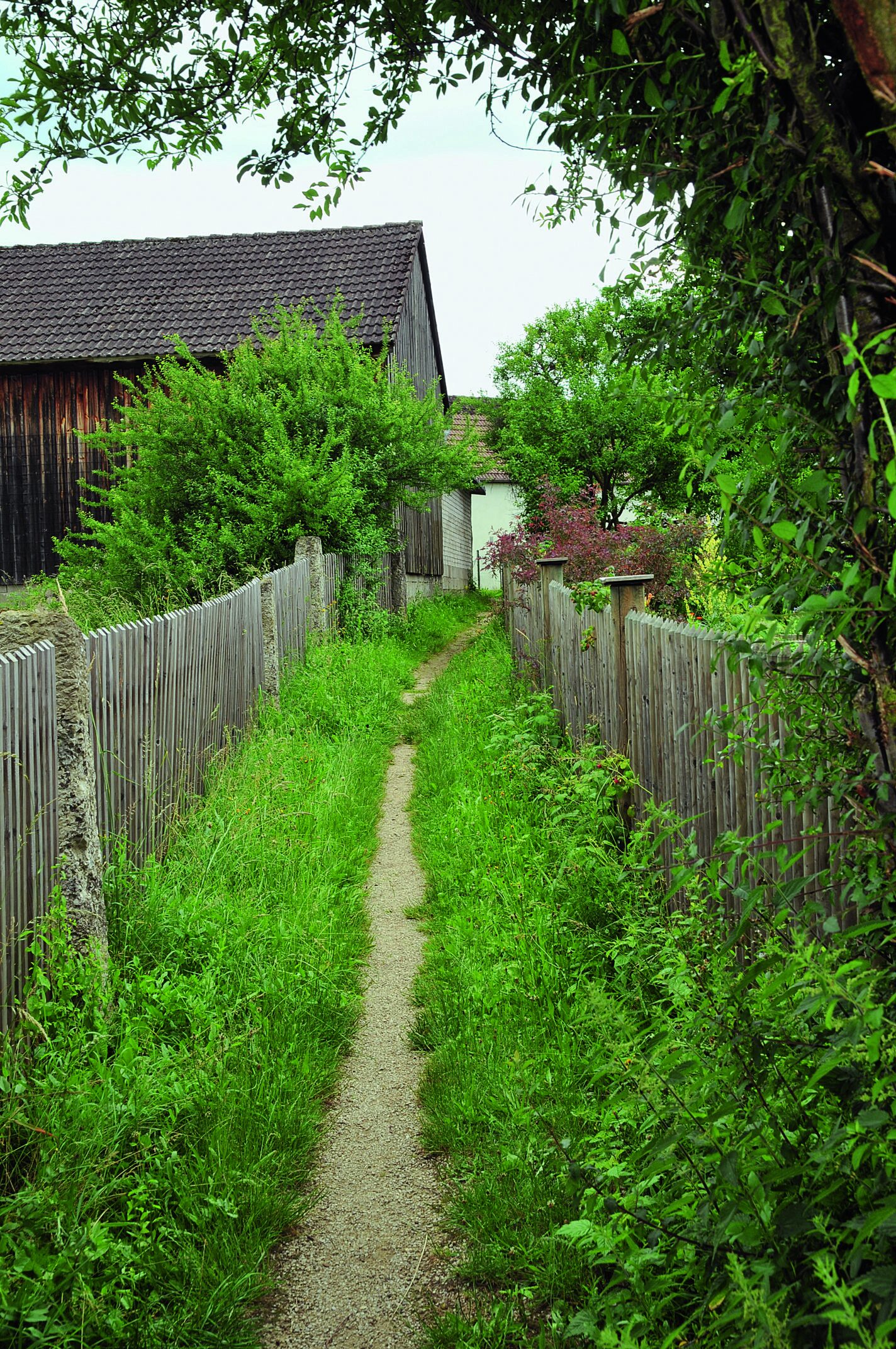 Neben diesen beiden wichtigsten Grenzen für das historische Dorf gab es aber viele weitere, die engste ist die von der durch die Dachtraufe gezogenen Linie um das Haus, dann folgt der Zaun oder der Graben um den Hof.10 Dann folgt die Einteilung der Flur in einzelne, den Hofinhabern zugewiesene Parzellen, ähnlich wichtig waren aber auch die Grenzen unterschiedlicher Landnutzungen, wie die Trennung von Feld zu Wald, von den Feldstücken der Bauern zu den Gemeindebesitzungen und zum Ödland, aber auch die wandernden Grenzen der Dreifelderwirtschaft von Winterfeld, Sommerfeld und Brache, alle unter Aufsicht der Siebener.
