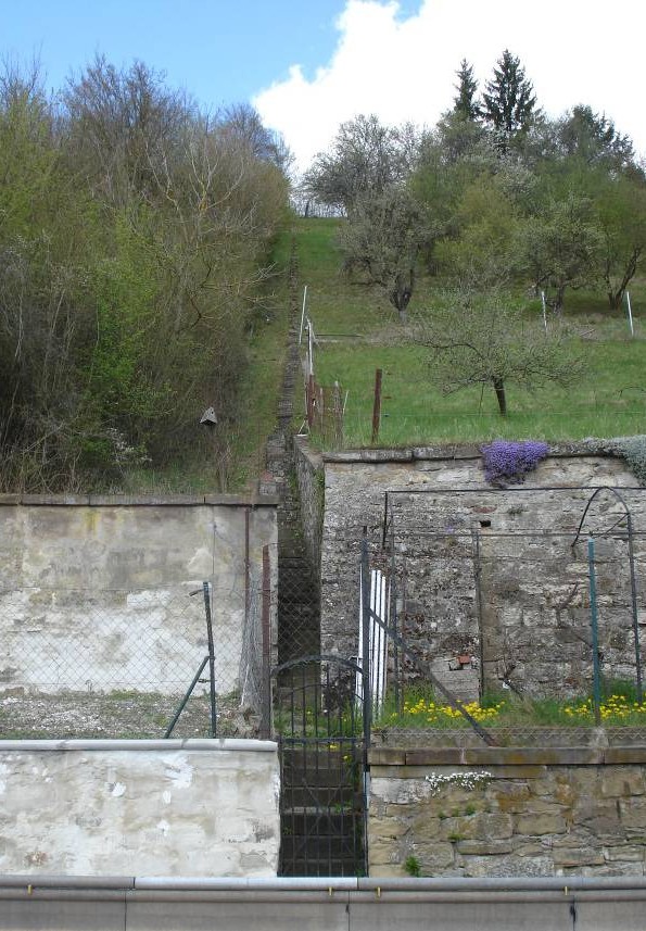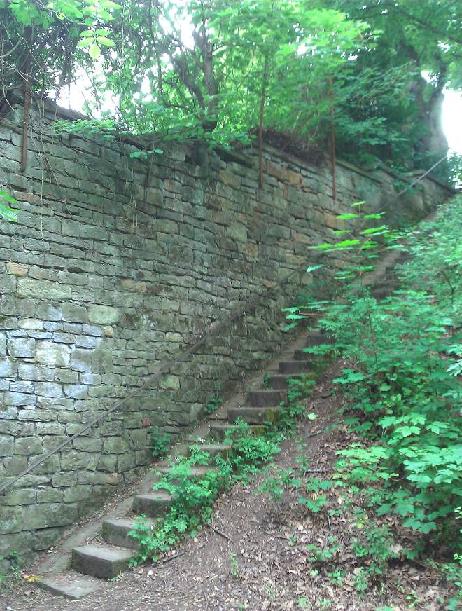 Trockenmauer den Treppenweg vom oberen zum unteren Fußweg flankierend