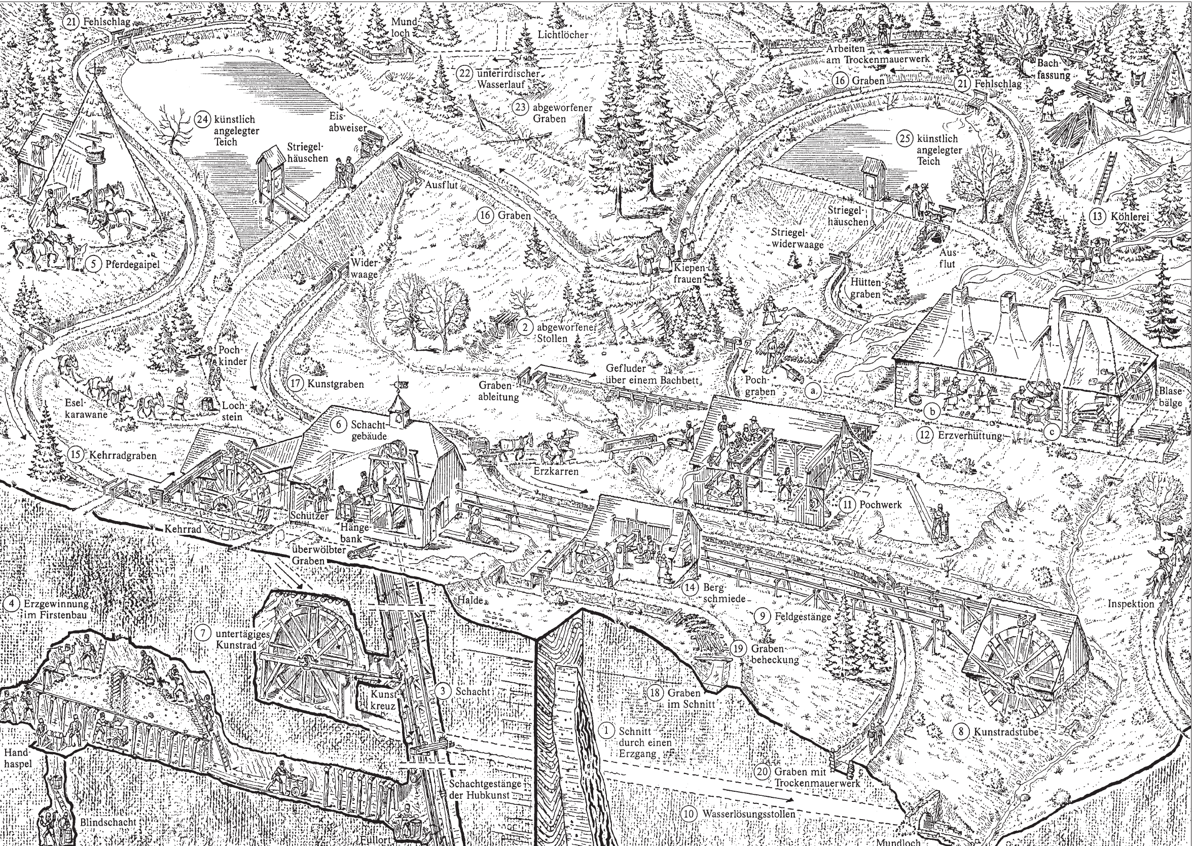 Schematische Darstellung der Nutzung der Wasserkraft im Oberharzer Gangerzbau. Quelle: https://www.harzwasserwerke.de/fileadmin/user_upload/downloads/files/pdf/Flyer/Flyer_Kulturdenkmal-Oberharzer-Wasserregal_Eine-schematische-Darstellung.pdf