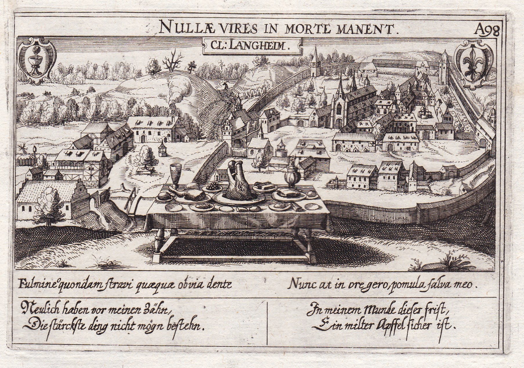 Eine Ansicht aus der Vogelschau von Daniel Meisner (1585-1625)21 um 1620 zeigt die gewachsenen mittelalterliche und nachmittelalterliche Struktur der Klosteranlage. Innerhalb der Mauer lässt sich zwar eine Trennung zwischen dem eigentlichen, dichter bebauten Klausurbereich und dem lockerer bebauten Wirtschaftsbauten feststellen, aber insgesamt ergibt sich ein ungeregeltes Bild. Die Anlage ist von einer Mauer umgeben, außerhalb fanden sich schon weitere zum Kloster gehörige Bauten.