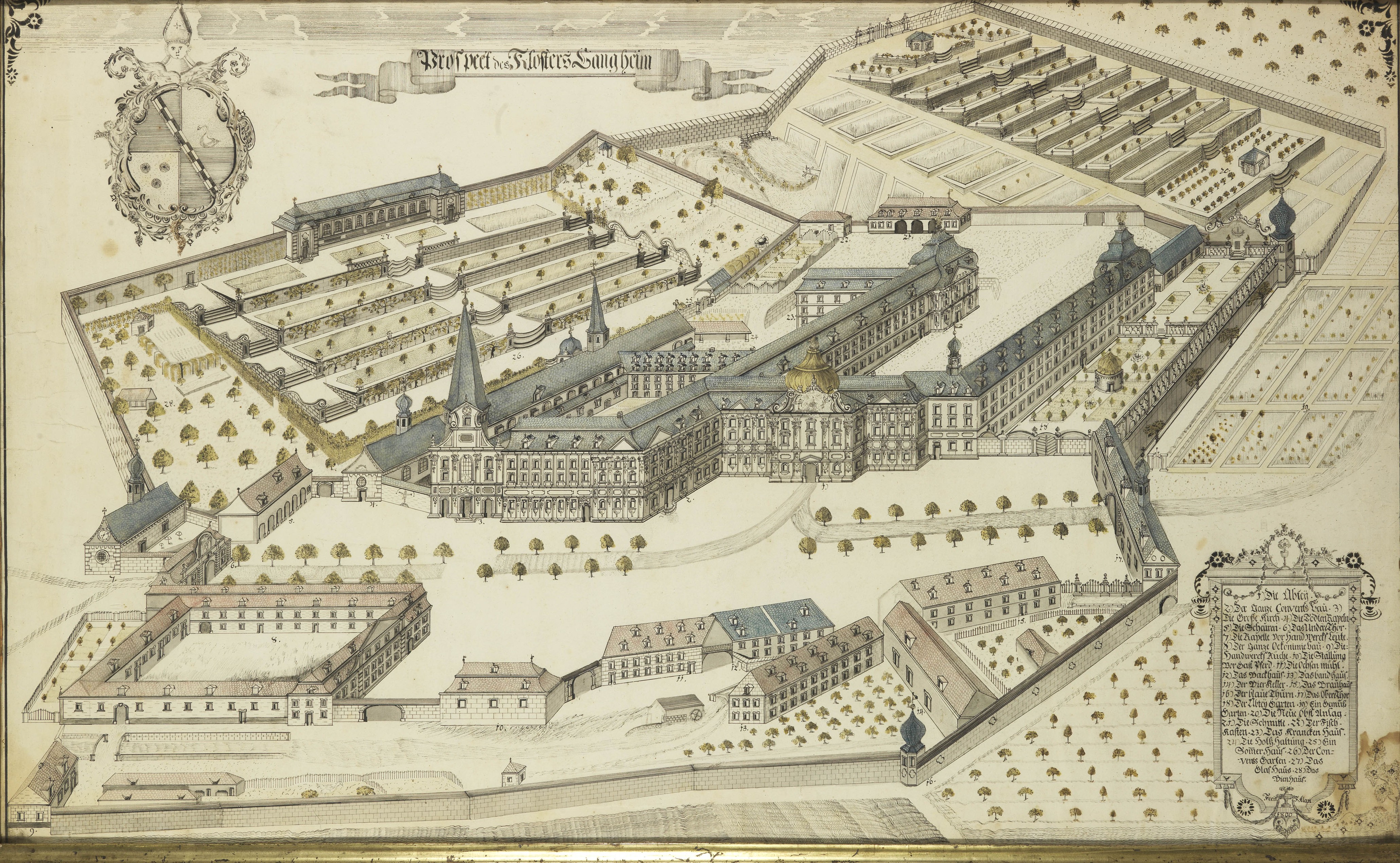 Erst die Barockzeit hat die Klosteranlage in mehreren Schritten zu ihrem heutigen regelhaften Erscheinungsbild geformt. Entscheidend zumindest für die visuelle Raumwirkung ist der Neubau der Klosterkirche mit ihrer nach Südwesten gerichteten Doppelturmfassade nach Plänen von Johann Dientzenhofer in den Jahren 1710-1719. Nach 1727 wurden die Arbeiten am neuen Konventbau im Anschluss an die Kirche fortgeführt, parallel östlich zum Abteibau, mit diesem durch den Bibliotheks- und Refektoriumsflügel sowie dem Bischofsbau verbunden. In diesem Zusammenhang muss auch die Aufrichtung der Terrasse ab 1717 und dann 1728 Erwähnung finden17, da sie elementar für die vom Kloster ausgehenden Blickbeziehungen wird. 1732 rät Balthasar Neumann für den Konventbau, bedacht auf die Fernwirkung der Anlage, zu einem dritten Geschoss.18 Der Vorhof der Klosteranlage mit den Wirtschaftsbauten konnte endlich 1772 fertiggestellt werden.