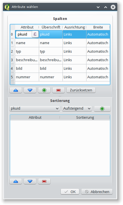 Die Raumsituation haben beim Labeln eine Nummer erhalten. Diese Nummern sollen unterhalb der Legende mit erläuternden Kurztexten versehen werden. Dafür wurde in der Attributtabelle des Layers “raeume” das Feld “name” angelegt. QGIS ermöglicht es, die Attributtabellen ganz oder in Teilen in die Druckzusammenstellung zu übernehmen.