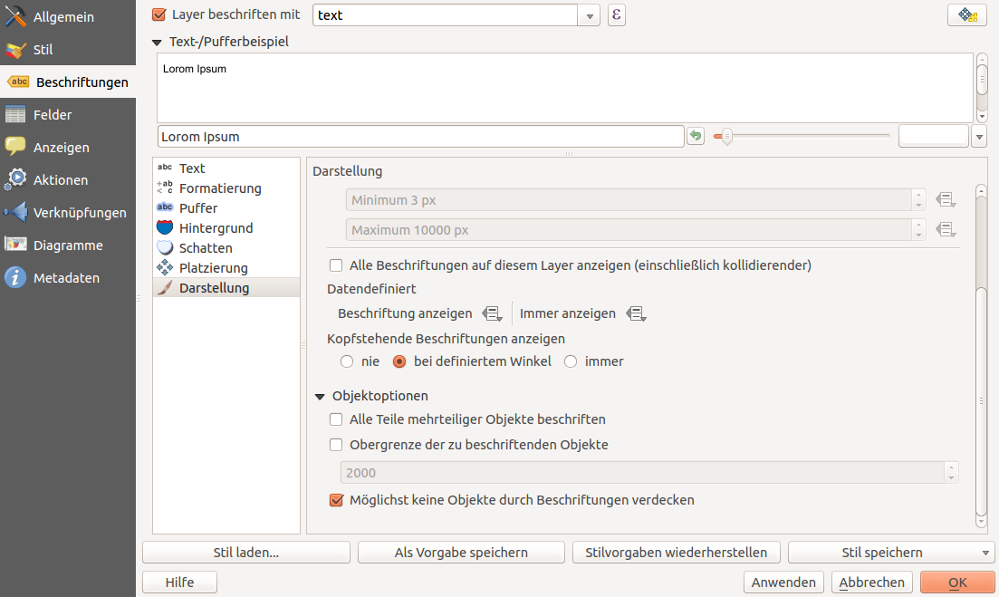 Die entscheidenden Einstellungen werden logischerweise im Reiter “Beschriftungen” vorgenommen. Zunächst wird hier das Beschriftungsfeld ausgewählt. Das ist das Feld “text”, das auch hier regelbasiert definiert oder eingeschränkt werden kann.