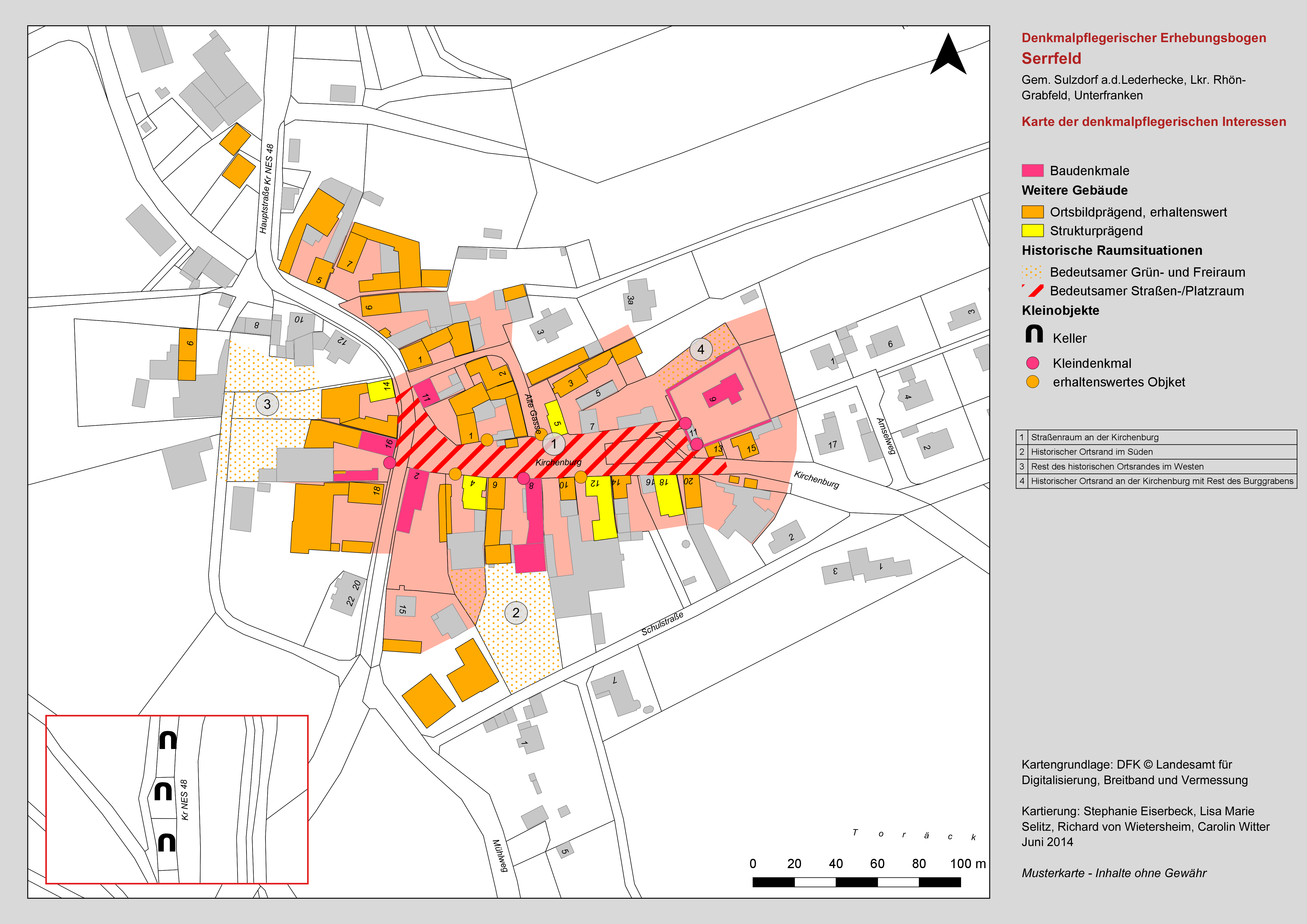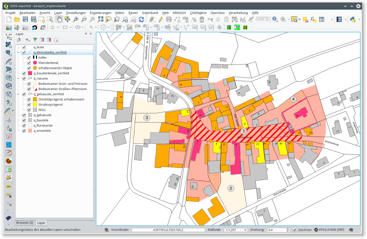 Die Karte der denkmalpflegerischen Interessen verlangt unter Umständen noch etwas mehr an Aufbereitung. Der Maßstab sollte idealerweise 1:1000 sein oder nah an 1:1000 liegen, denn nur so behalten die Beschriftungen der Grundkarte ihre sinnvolle Position.