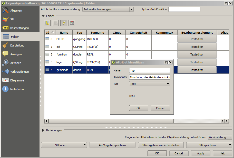 Das Erstellen einer Spatialite oder GeoPackage-Datenbank ist in QGIS momentan noch etwas inkonsistent geregelt, denn man kann nicht einfach die Datenbank erzeugen, sondern man muss auch gleich eine Tabelle (= möglicher Layer in QGIS) innerhalb der Datenbank anlegen. Dies geht mit dem Menupunkt „Layer“ – „Layer erstellen“ – „Neuer GeoPackage-Layer“ (oder gleich Shift+Umschalt+n). Dann gibt man den Datenbanknamen an und erzeugt eine Dummie-Tabelle, die kann auch ohne Geometrie sein, weil sie nach der Erzeugung der Datenbank auch gleich wieder gelöscht werden kann. Analog geht dies auch mit Spatialite. Dann kann man die Datenbank Schritt für Schritt mit den notwendigen Layern, die in den nächsten Kapiteln vorgestellt werden, befüllen. Hat man auch die notwendigen Stile in die Datenbank geschrieben, erspart man sich bei der Erstellung eines weiteren Erhebungsbogens, der in der selben Datenbank gespeichert werden kann, weitere Arbeit.