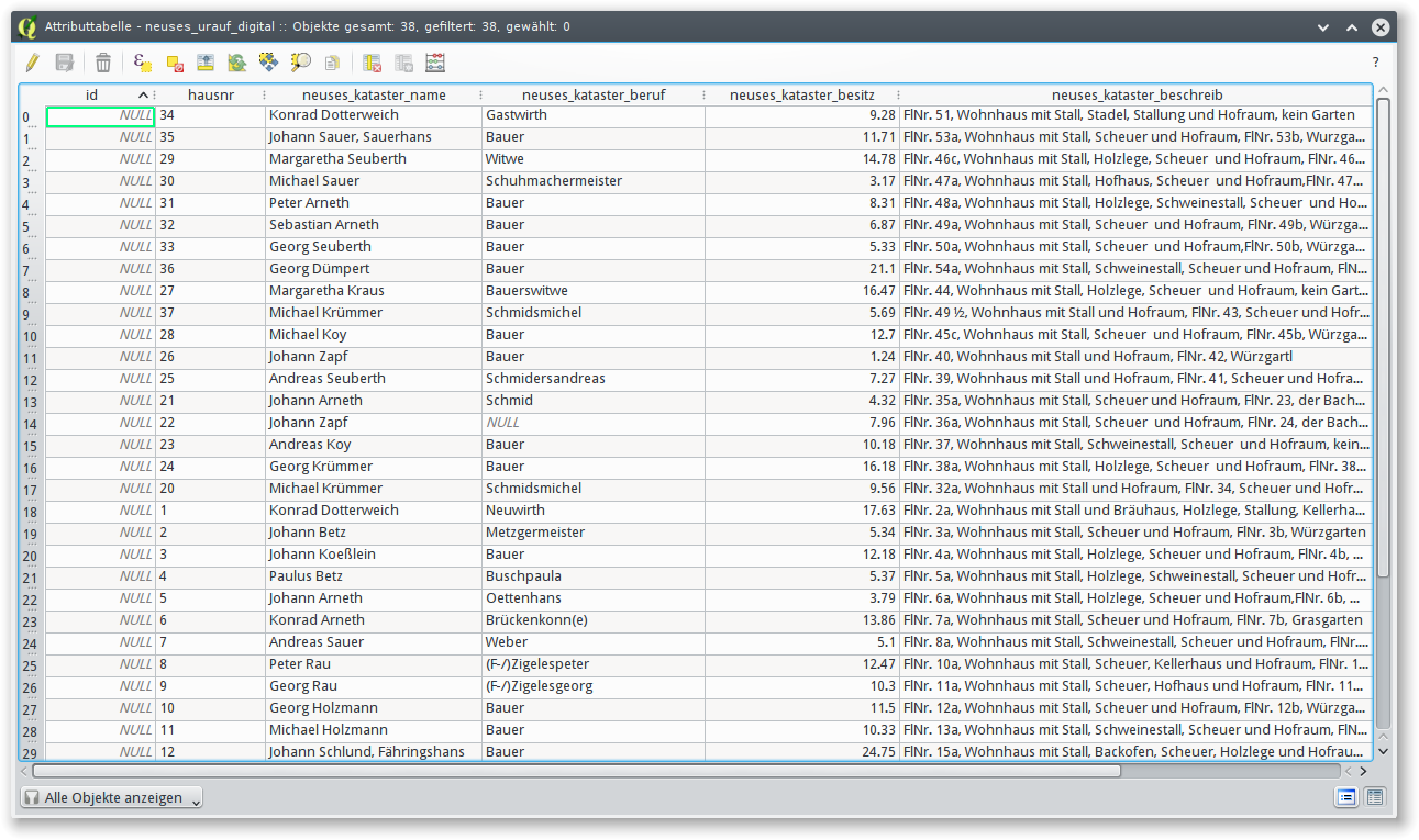 Dazu nimmt man als Eingangsvektorlayer die digitalisierte Uraufnahme und als Differenzlayer den aktuellen Gebäudelayer. Das Ergebnis zeigt die Gebäudegrundrisse, die um 1850 da waren und es heute nicht mehr sind, als eigenständigen Shape-Layer.