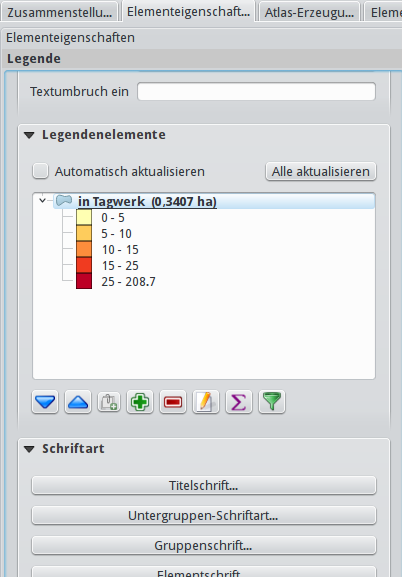 eingefügt. Grundsätzlich werden in der Legende dann alle Layer der Karte angeführt, deswegen beginnt die Vorgehensweise bei der Gestaltung einer Legende erst einmal damit, die nicht relevanten Layer mit dem Minus-Zeichen unter dem Legenden-Bearbeitungsbereich zu entfernen. Dann können die Schriftarten, Farben, Abstände und auch die Texte für jede Ebene der Legende seperat geändert werden.