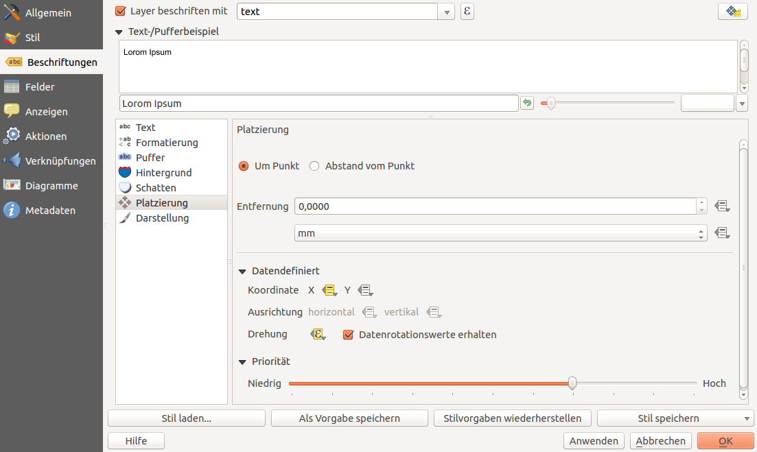 In QGIS werden alle diesbezüglichen Einstellungen im Kontextmenu des Layerbedienfeldes einegstellt (rechte Maustaste bei gewähltem Layer X_texte.shp).