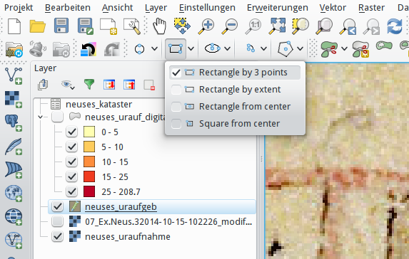 Normale Gebäude werden am leichtesten mit CADDigitize erzeugt (In QGIS 3 standardmäßig dabei als Werkzeugleiste für Formen). Dies ermöglicht es beispielsweise ein Rechteck aus drei Punkten zu erzeugen. Da Häuser, auch historische, doch in aller Regel einen (weitestgehend) rechtwinkligen Grundriss aufweisen, ist dies ein guter Weg, Hausgrundrisse zu digitalisieren. Mit dem normalen Polygontools wird man nur selten wirklich vier rechte Winkel und gleichlange parallele Seiten erreichen.