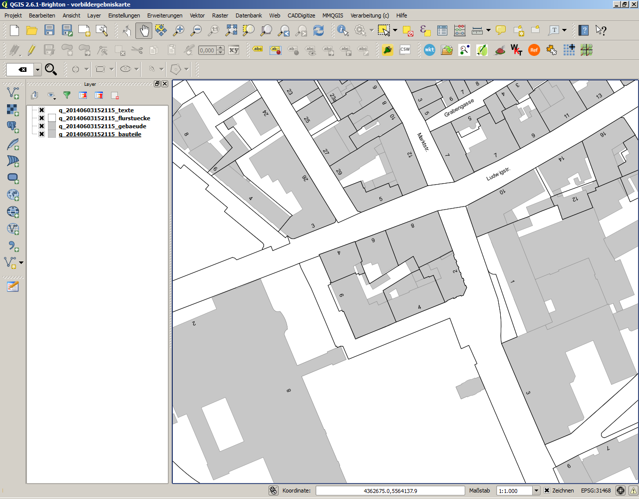 Die einzelnen Layer X_flurstuecke.shp, X_gebaeude.shp, X_bauteile.shp, X_grenzpunkte.shp, X_gebaeude-punkte.shp, X_aufnahme-punkte.shp, X_texte.shp, X_symbole.shp sollten sich problemlos mit dem KBS 31468 (DHDN / Gauss-Kruger zone 4) einlesen lassen. Shapes oder allgemeiner Vektordateien können auf unterschiedliche Art und Weise eingebunden werden.