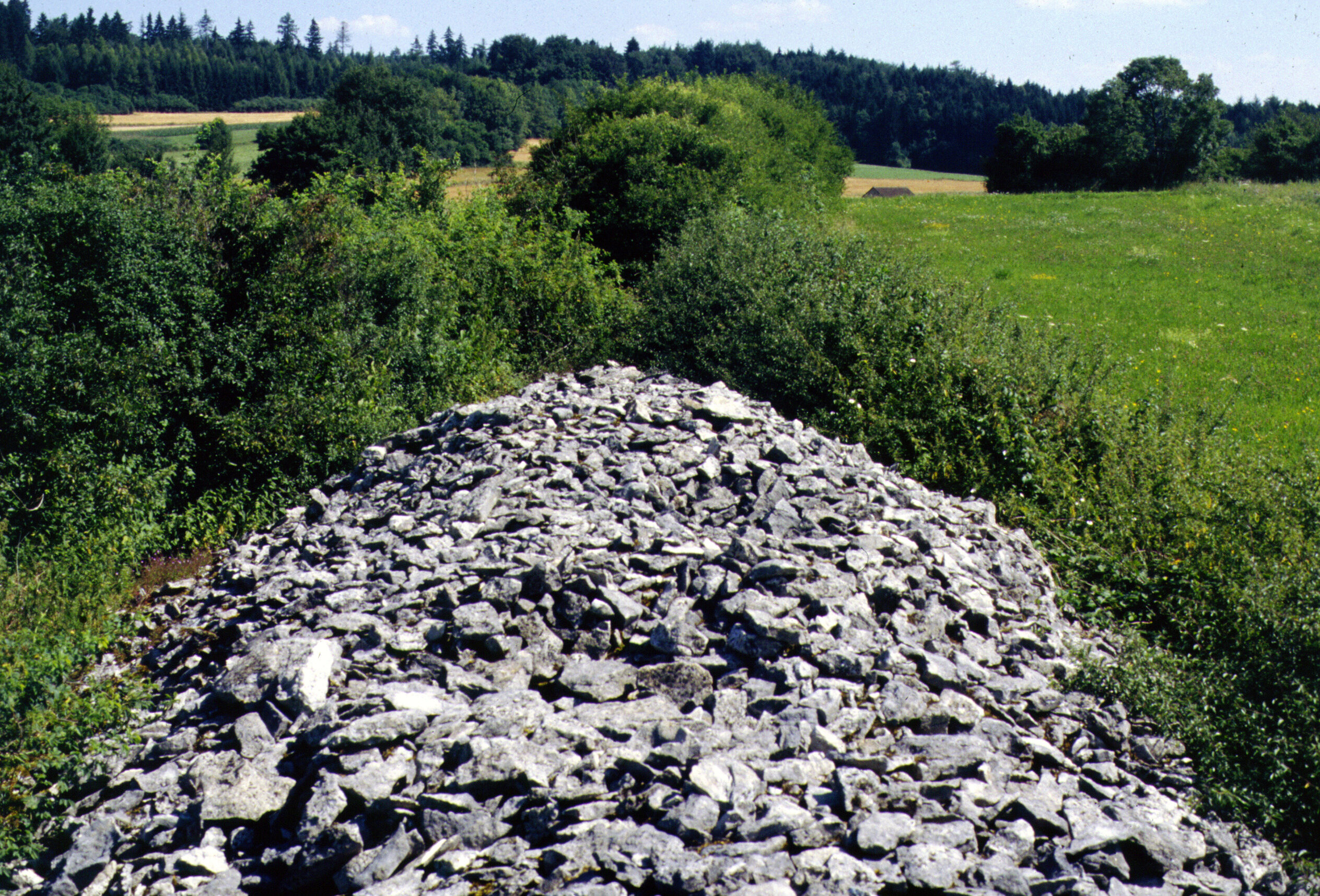 Lesesteinanlagen stehen oft direkt mit Heckensäumen in Verbindung, da sie häufig Gehölz aufwachsen ließen, das früher wesentlich stärker genutzt und damit zurückgeschnitten wurde, heute sich aber oft zu Hecken auswachsen kann. Die eindrucksvollsten grenzanzeigenden Hecken in Bayern sind die der Baumhecken- oder Haglandschaften42 im südlichen Oberbayern, etwa im Isartal zwischen Bad Tölz und Lenggries. Diese Baumhecken besitzen einen zweistufigen Aufbau, am Boden befindet sich eine Strauchschicht, darüber die Baumschicht aus Laubbäumen wie Stieleiche, Winterlinde und Bergahorn. Dies Haglandschaften stehen in direktem Zusammenhang mit der Egartwirtschaft, die eine Wechselwirtschaft von Ackerland und Grünland auf der selben Fläche beinhaltet. Es konnte daher sein, dass beweidete und ackerbaulich genutzte Flächen direkt nebeneinanderlagen, was eine Abgrenzung nötig machte. Da zweite Schwerpunkt dieser Haglandschaft liegt westlich von Miesbach, hier grenze die Baumhecken keine Streifen, sondern Blöcke von einander ab.43