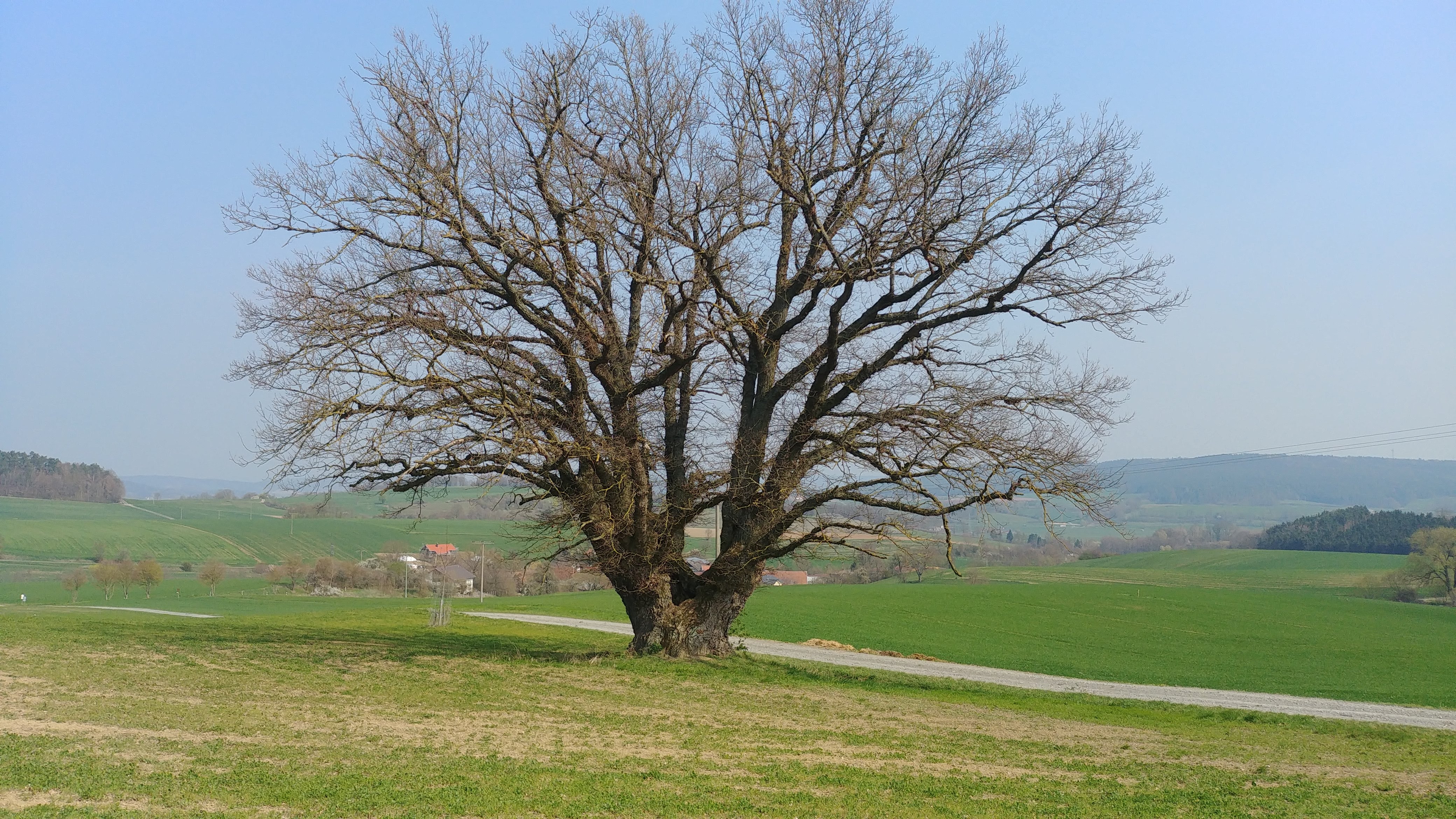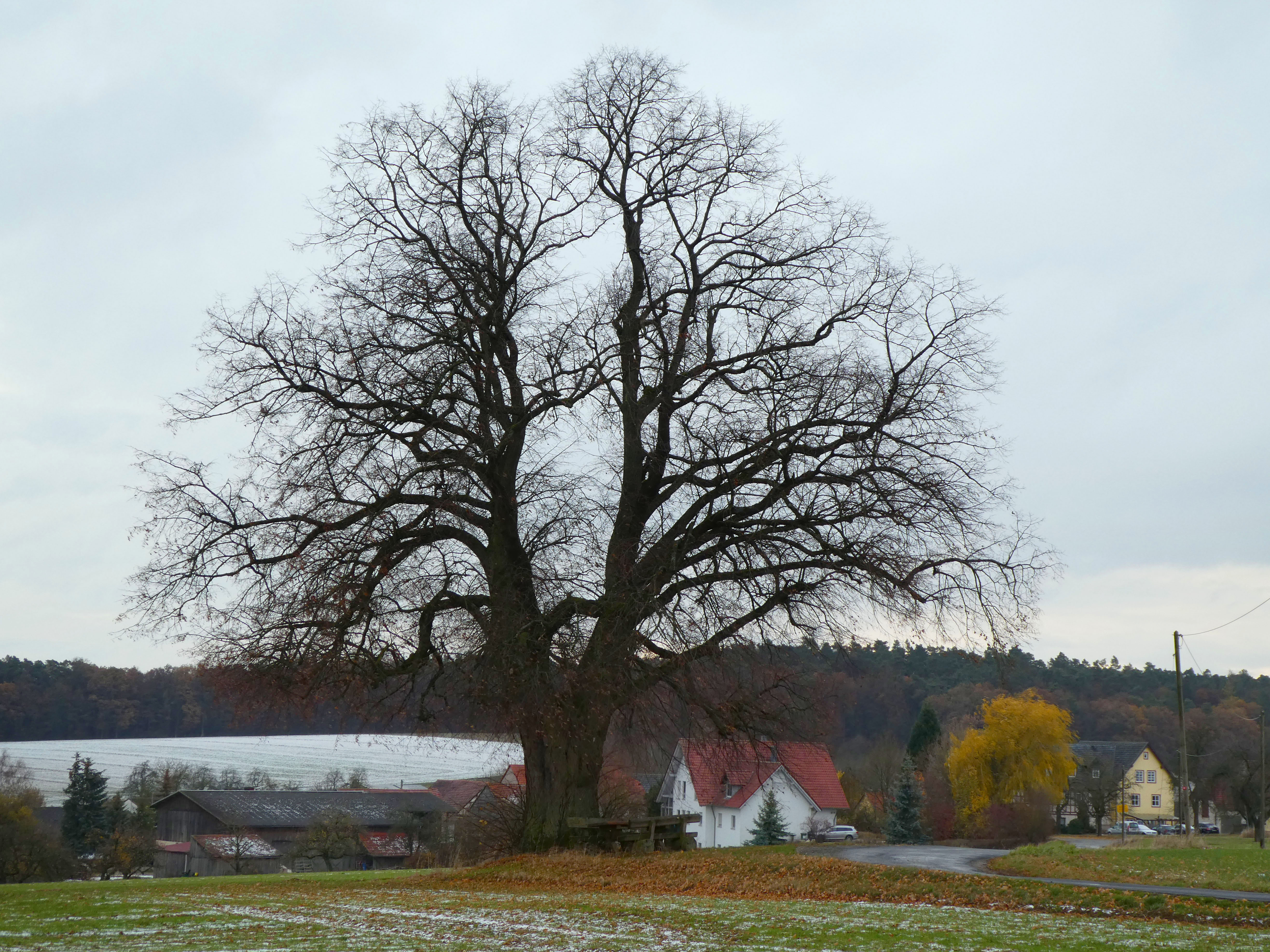 Bäume sind zunächst natürliche Elemente der Landschaft, sie können allerdings vom Menschen bewusst an bestimmte Punkte gesetzt werden oder es können bereits bestehende Bäume als Grenzzeichen markiert werden. Auch wenn die ältere Forschung Grenzbäume schon in der Merowinger- und Karolingerzeit verbreitet sehen will, gelingen konkrete Nachweise eher selten. In der Grenzbeschreibung von Gosheim am Rande des Rieses von 793 ging ein Abschnitt usque ad magnum rubum (bis an die große Eiche), wobei in diesem Zusammenhang auch die Lache genannt wird, was in dieser Zeit nicht nur Sumpf, sondern auch „Grenzzeichen“ bedeutet.18 In der Zweiten Würzburger Markbeschreibung ist von der Rabans-Buche (Rabanes buohha) als Grenzmarkierung die Rede.19 Grenzbäume werden daher auch Lachbäume/Lochbäume, später auch Mark- oder Marchbäume und Rainbaum genannt. Spezielle Markierungen, die auf bestimmte herrschaftliche Zugehörigkeiten schließen lassen, kann man erst am Ausgang des Mittelalters nachweisen.20 So werden bei der Grenzmarkierung zwischen dem Markgraftum Brandenburg-Kulmbach und der Herrschaft derer von Wildenstein um 1500 Bäume in die zumeist mit Steinen markierte Grenzkette einbezogen. Darunter sind eine Puchen, daran ein + und drei hieb verzeichnet , oder ein fohrleine am weg stehend, darein drei hieb geschehen, eine Fichte, unter deren Wurzel man einen Stein mit einem Kreuz gelegt hat und eine Tanne, die schon ein Kreuzeichen hatte, zu der nun noch drei Hiebe kamen.21 Das waren aber keine markanten Einzelbäume, sondern solche, die im Wald im Verlauf der Grenze standen. Wenn möglich wurden aber auch weithin sichtbare, landschaftsprägende Baume einbezogen, wie in der Marckung und Rainung des Amtes Hohenberg, wo man sich auf eine grosse aichen, darein creutz gehauen sind.22 Grenzbäume sollten langlebig sein, sie konnten aber auch zu bestimmten Formen gezwungen werden. Im Raum Bamberg wurden sie manchmal gezwieselt, also zur Ausbildung von zwei Wipfeln gezwungen, wie etwa die Linde an der Gemarkungsgrenze zwischen Erlhof und Eggenbach (Lkr. Lichtenfels) oder etwa die Oberoberndorfer Linde an der Grenze dieses Ortes zu Windischletten (Lkr. Bamberg), der zu dem auch an einer Altstraße liegt, die auf der Kammlinie eines Höhenzugs führt und auf längerer Strecke bis heute die Gemeindegrenze bildet.