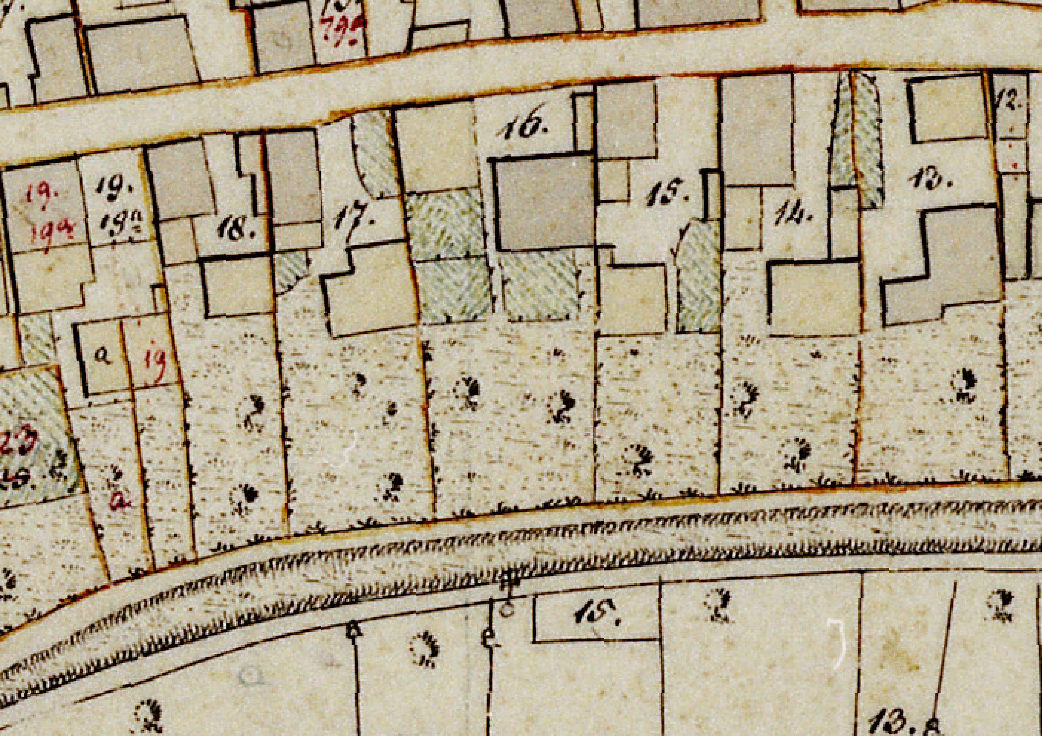 Neben diesen beiden wichtigsten Grenzen für das historische Dorf gab es aber viele weitere, die engste ist die von der durch die Dachtraufe gezogenen Linie um das Haus, dann folgt der Zaun oder der Graben um den Hof.10 Dann folgt die Einteilung der Flur in einzelne, den Hofinhabern zugewiesene Parzellen, ähnlich wichtig waren aber auch die Grenzen unterschiedlicher Landnutzungen, wie die Trennung von Feld zu Wald, von den Feldstücken der Bauern zu den Gemeindebesitzungen und zum Ödland, aber auch die wandernden Grenzen der Dreifelderwirtschaft von Winterfeld, Sommerfeld und Brache, alle unter Aufsicht der Siebener.
