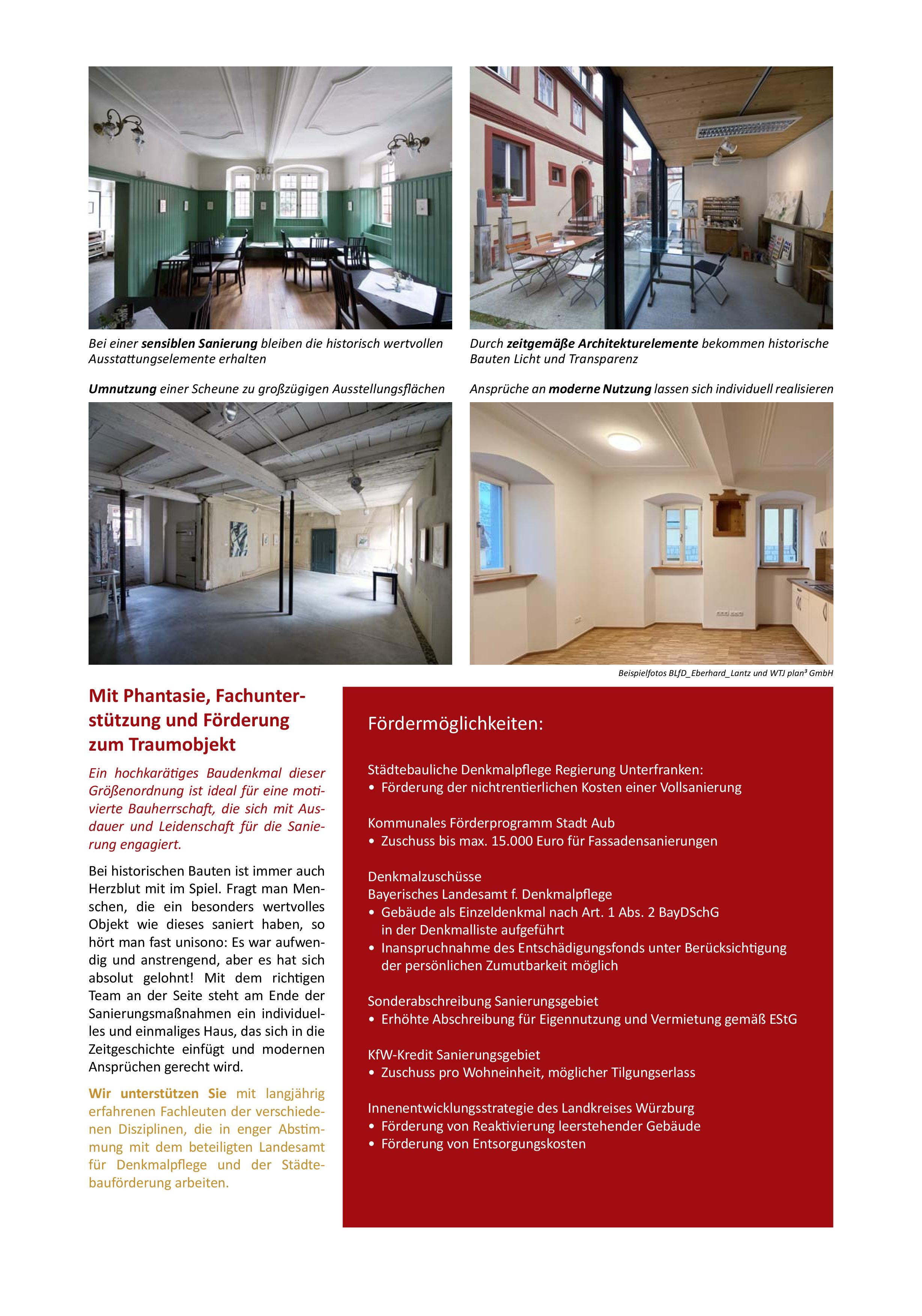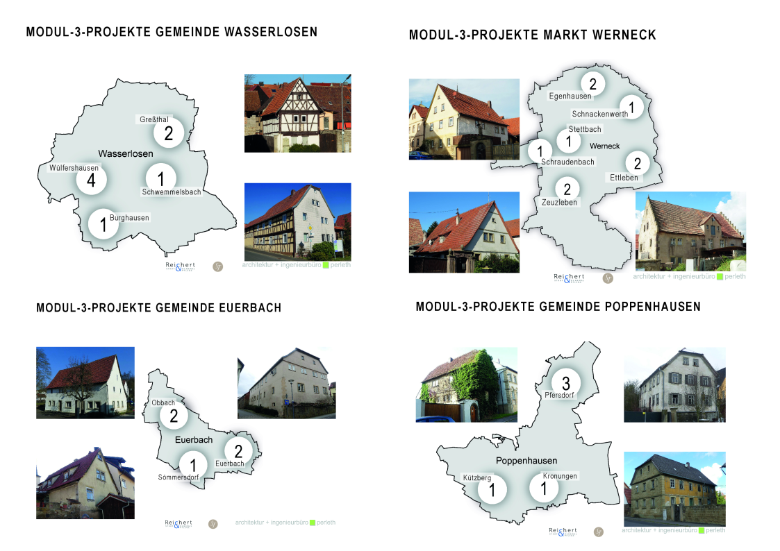 Das Projekt fördern zugleich das Amt für Ländliche Entwicklung (ALE) für Unterfranken und das Bayerische Landesamt für Denkmalpflege (BLfD). Das ALE übernimmt nach der Vorbereitungsphase der beiden Module 1 und 2 Förderungen der erhaltenswerten Bausubstanz, das BLfD versucht die Sanierung von besonders dringlichen Denkmalobjekten zu aktivieren.