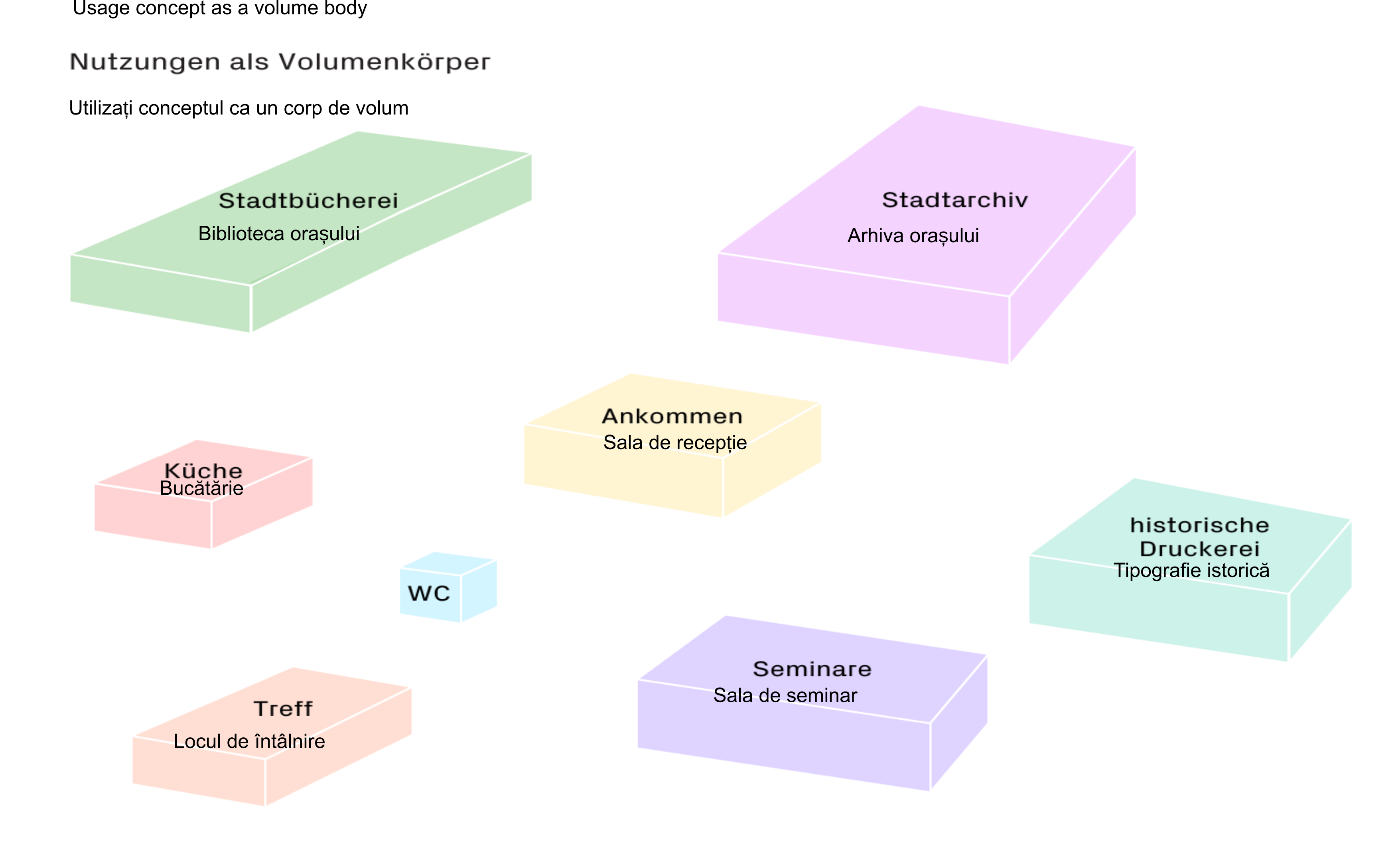 KDK Mainbernheim Modul 3 – Herrnstraße 35 und 37 – Nutzungskonzept als Volumenmodell. Erarbeitung: Schlicht Lamprecht Kern Architekten, Schweinfurt