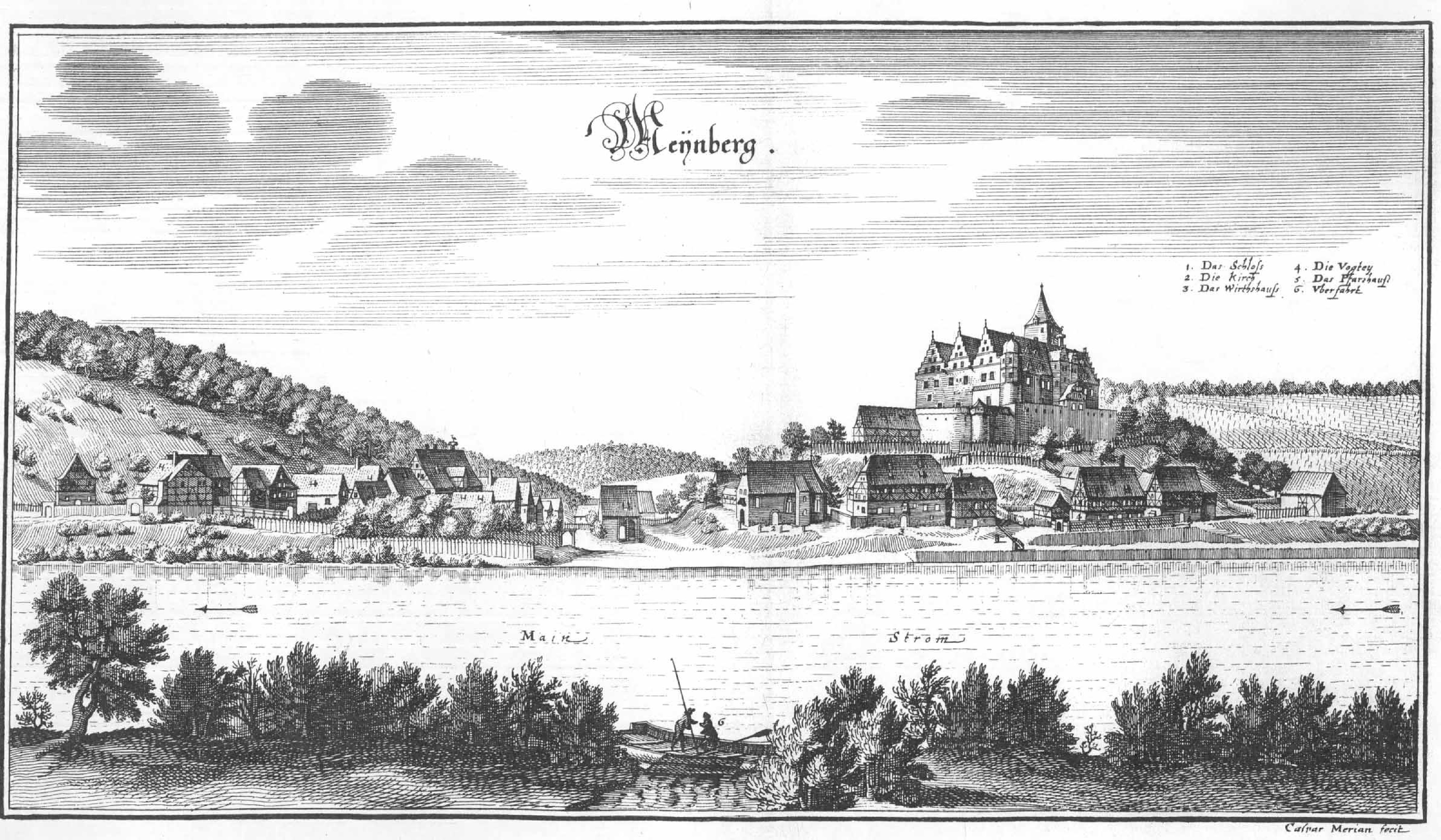 Matthäus Merian:Topographia Franconiae (1656). Main mit Schloss und Dorf Mainberg