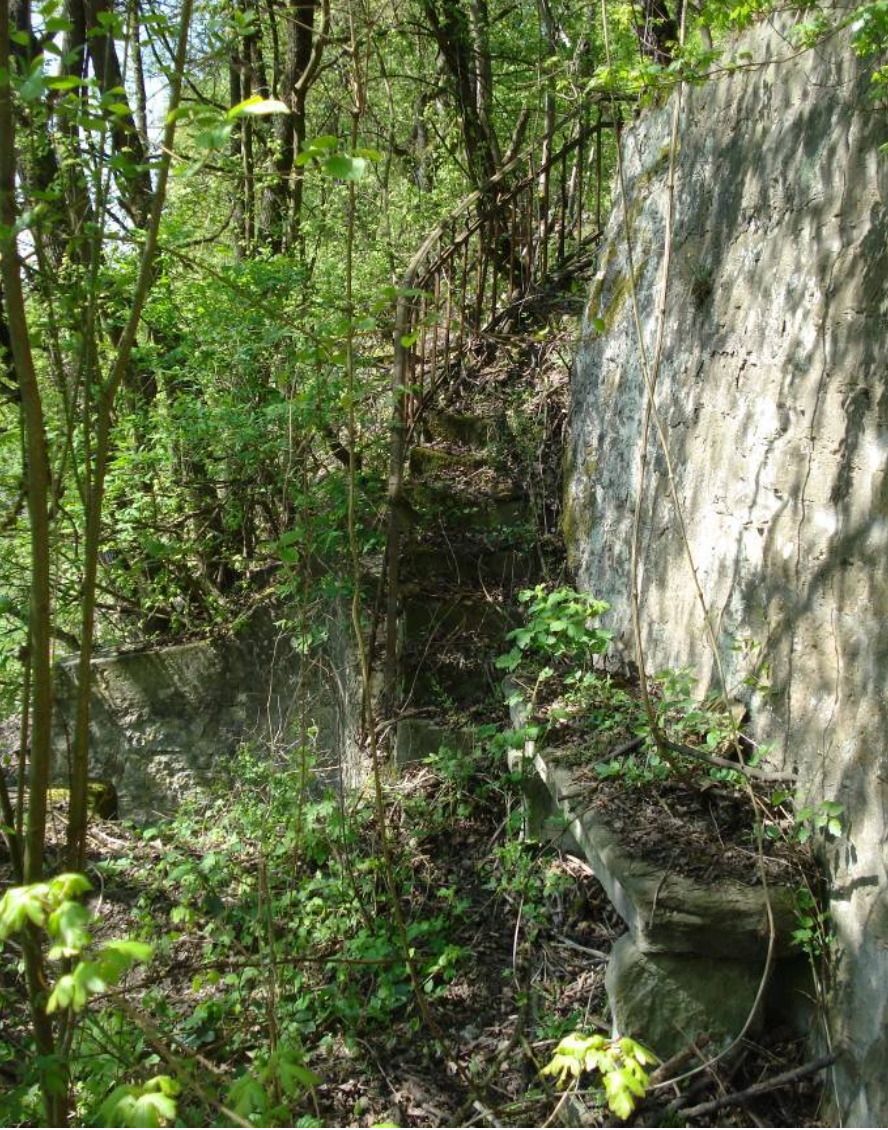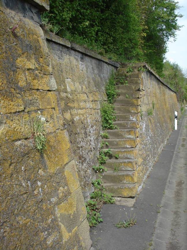 Trockenmauer den Treppenweg vom oberen zum unteren Fußweg flankierend