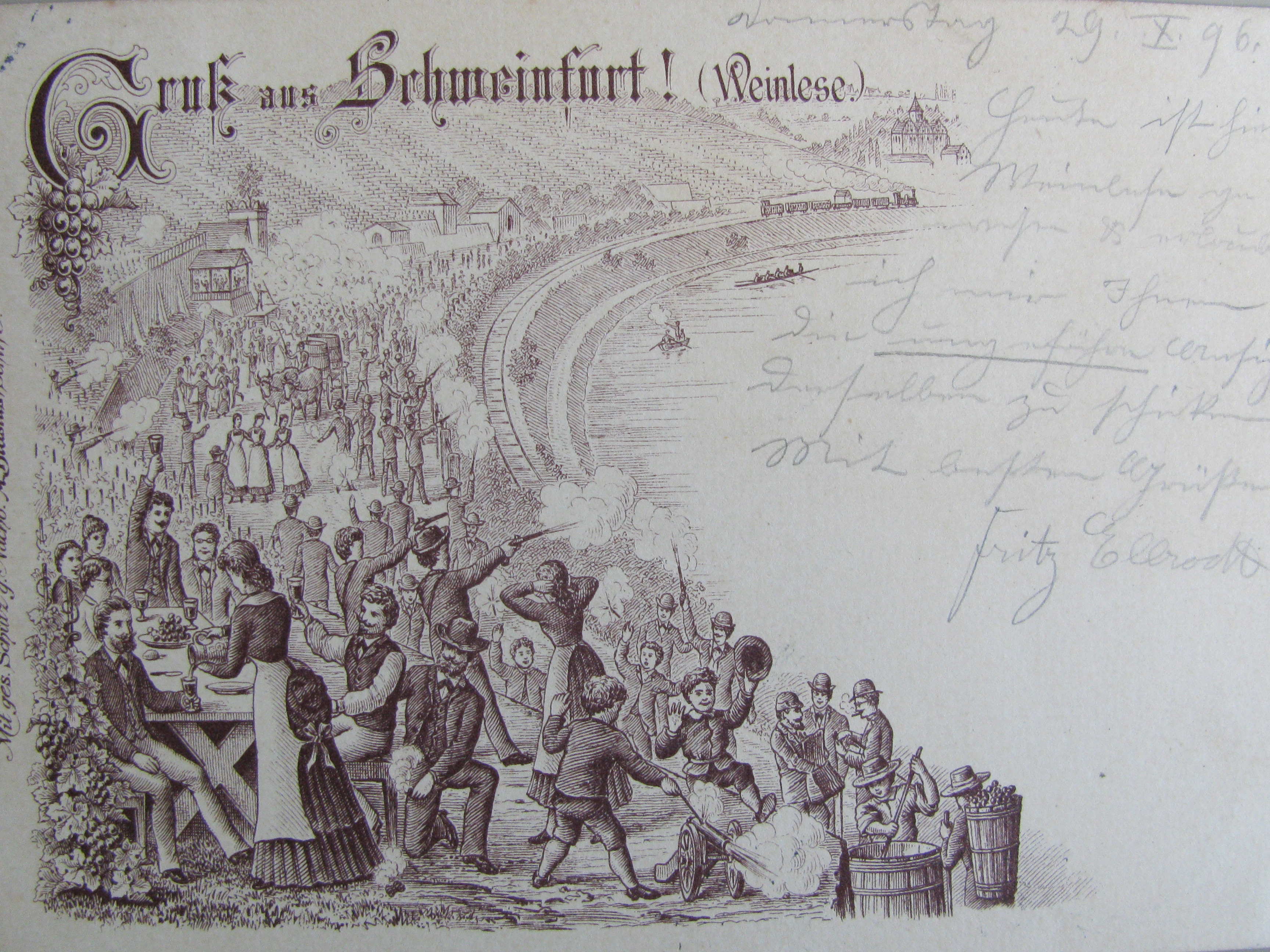 „Und nun biegt die Bahn an herrlichen Weinbergen und schönen Lustgärten mit freundlichen mitunter prächtigen Gartenhäusern vorüber in den Bahnhof zu zu Schweinfurt ein.“
