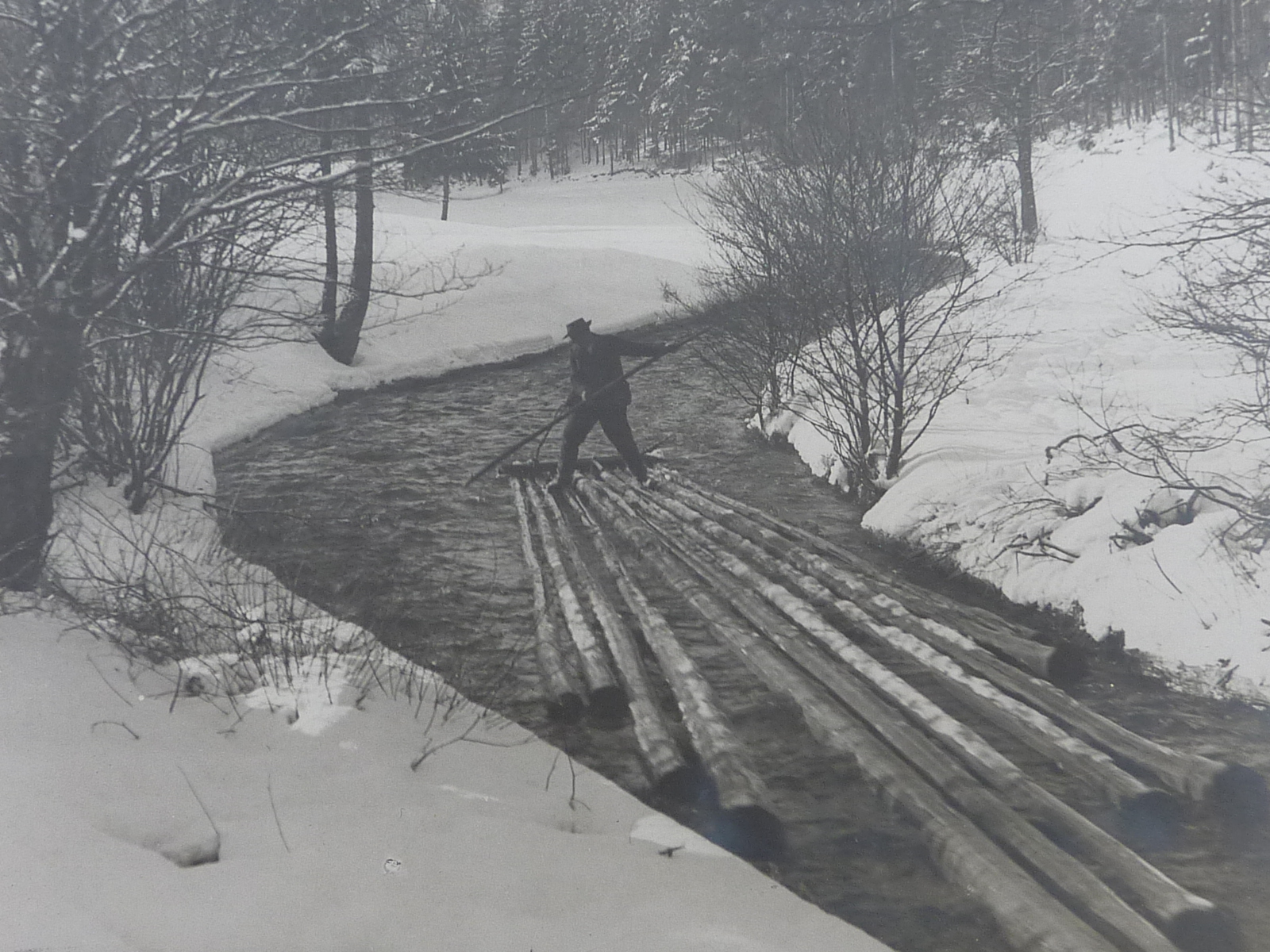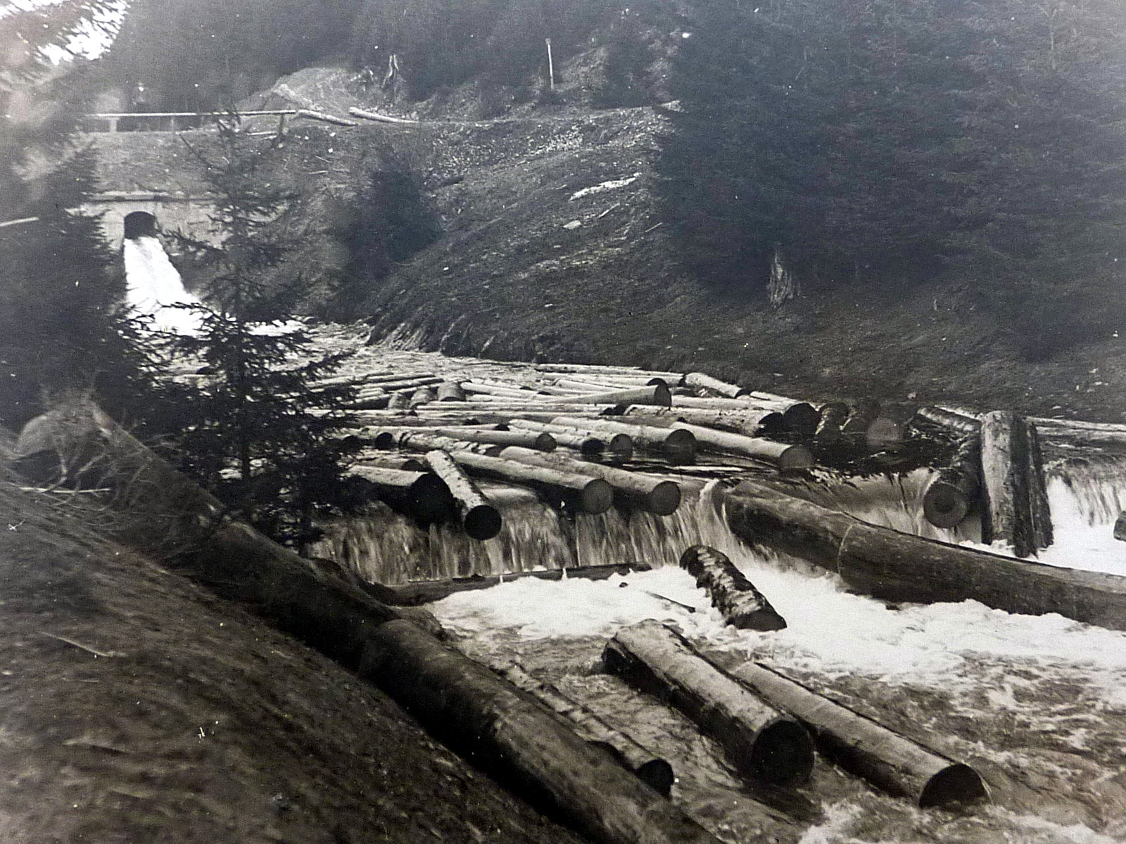 Blöcher (Baumabschnitte) werden weggeschwemmt. Quelle: Archiv Flößermuseum Unterrodach