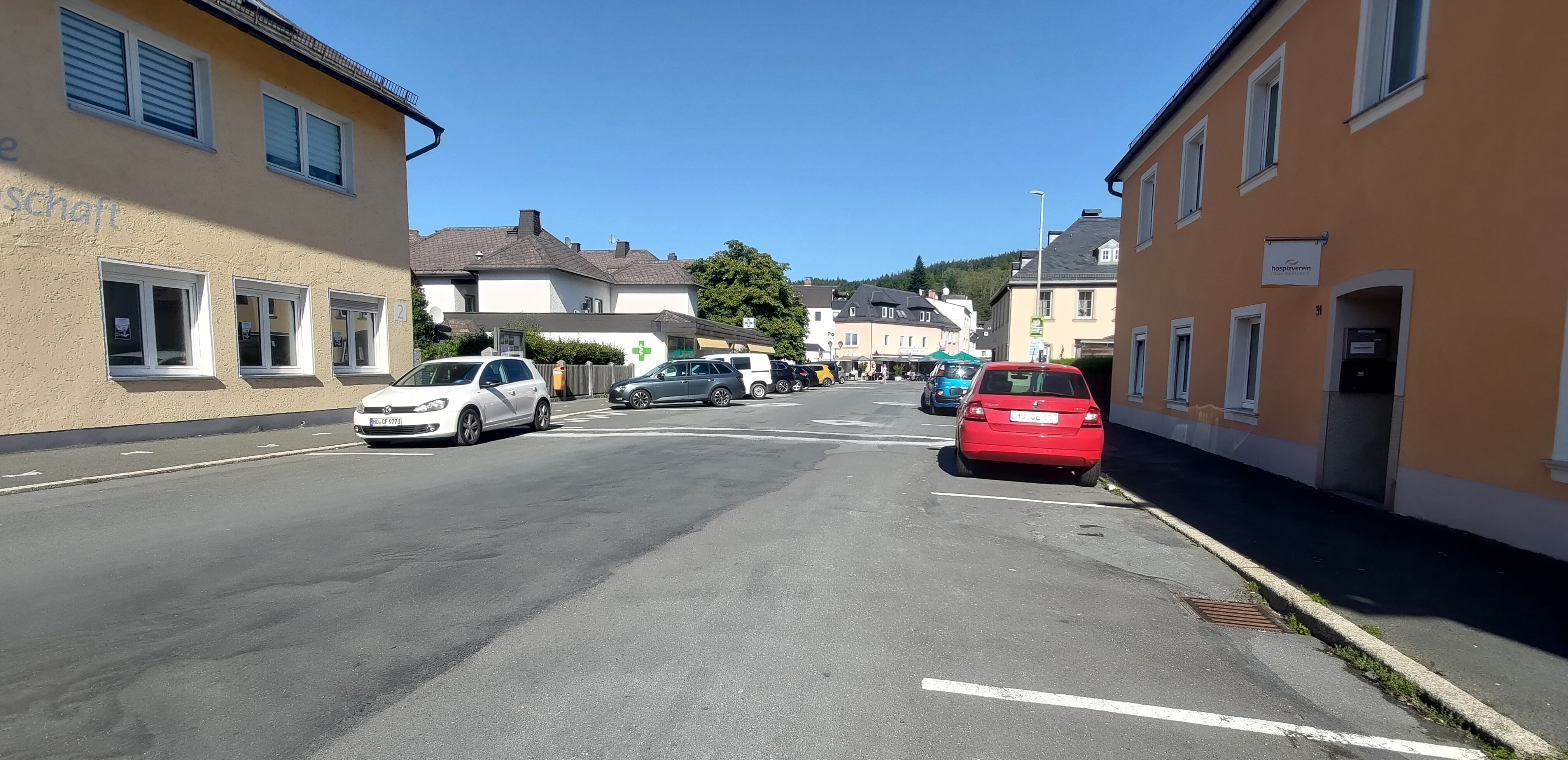 Straßenraum der Kronacher Straße in Naila heute – der Culmitz-Bach ist aus dem Stadtbild verschwunden. Foto: Thomas Gunzelmann 9/2023