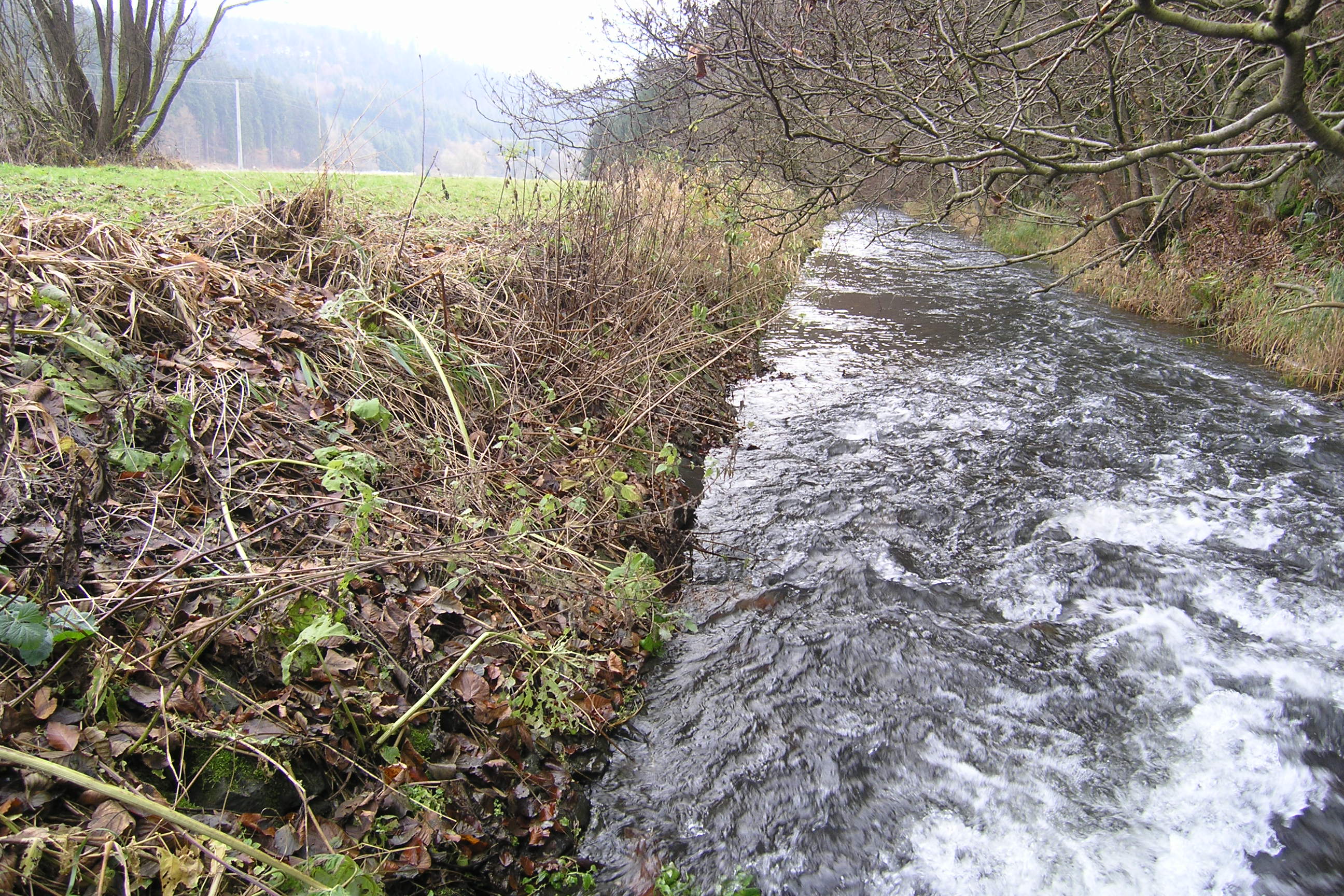 Aus der Talmitte an den Talrand verlegter, geradliniger Lauf der Wilden Rodach. Foto: Christine Dorn, 15.11.2004